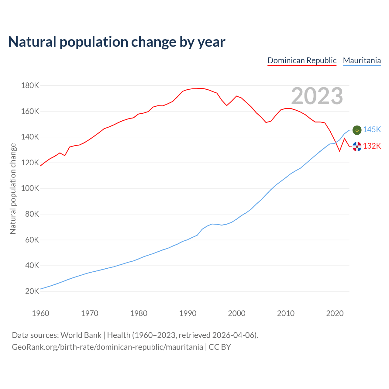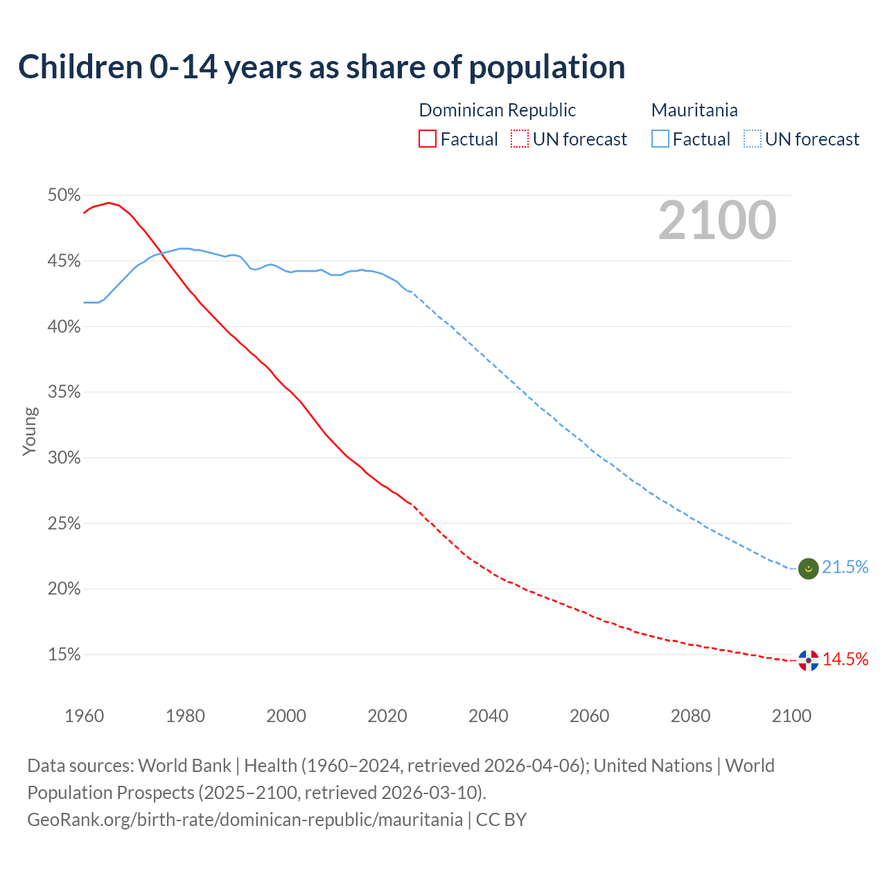 The Dominican Republic has an annual birth rate of 17.9 births per 1,000 people, compared to 34.4 for Mauritania. The average number of children a woman is expected to have during her lifetime — the fertility rate, is 2.24 in the Dominican Republic and 4.7 in Mauritania — 109.4% difference.