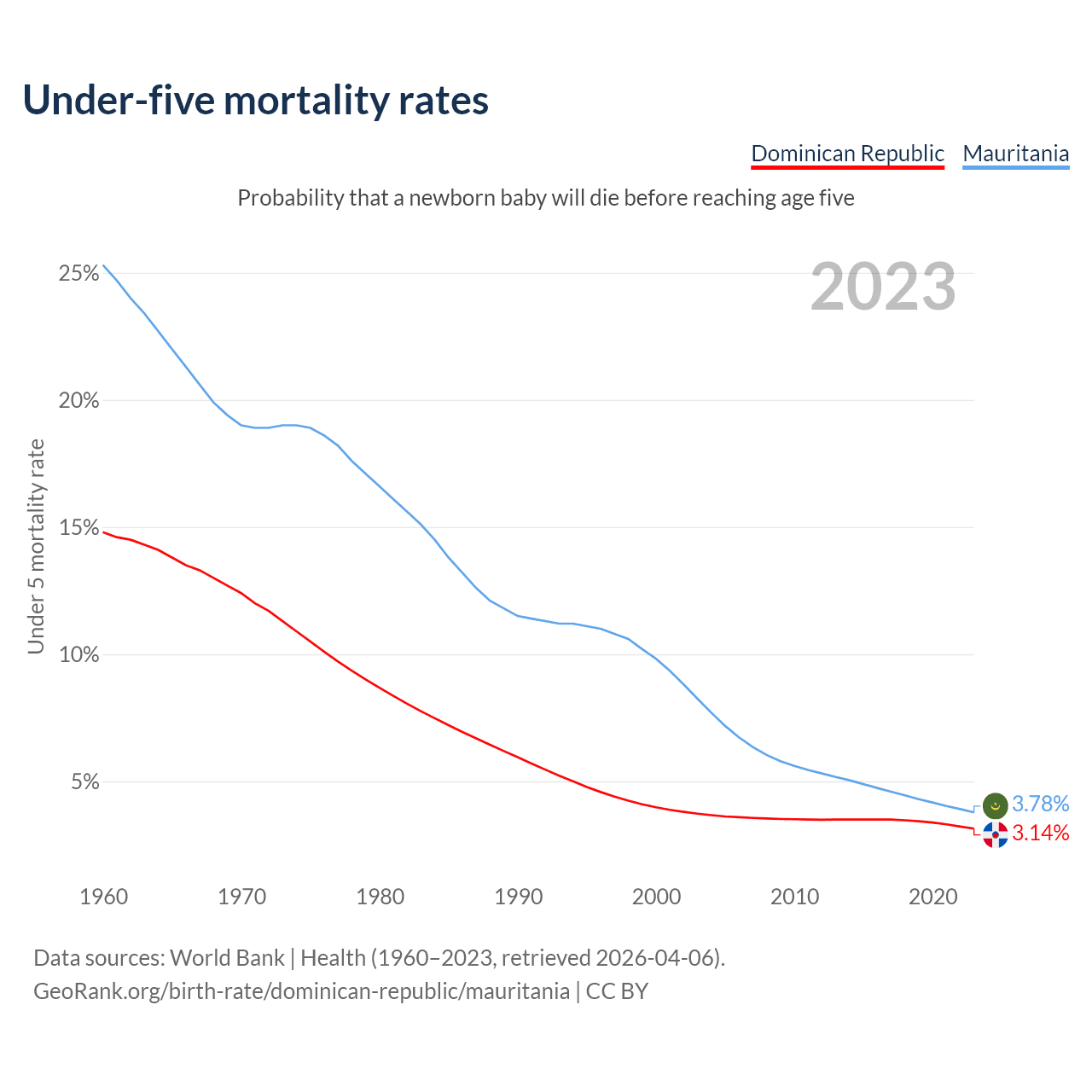 The chance that a newborn baby will die before reaching age five is 3.14% in the Dominican Republic and 3.78% in Mauritania. Above is a chart with historical data on under-five mortality rates.