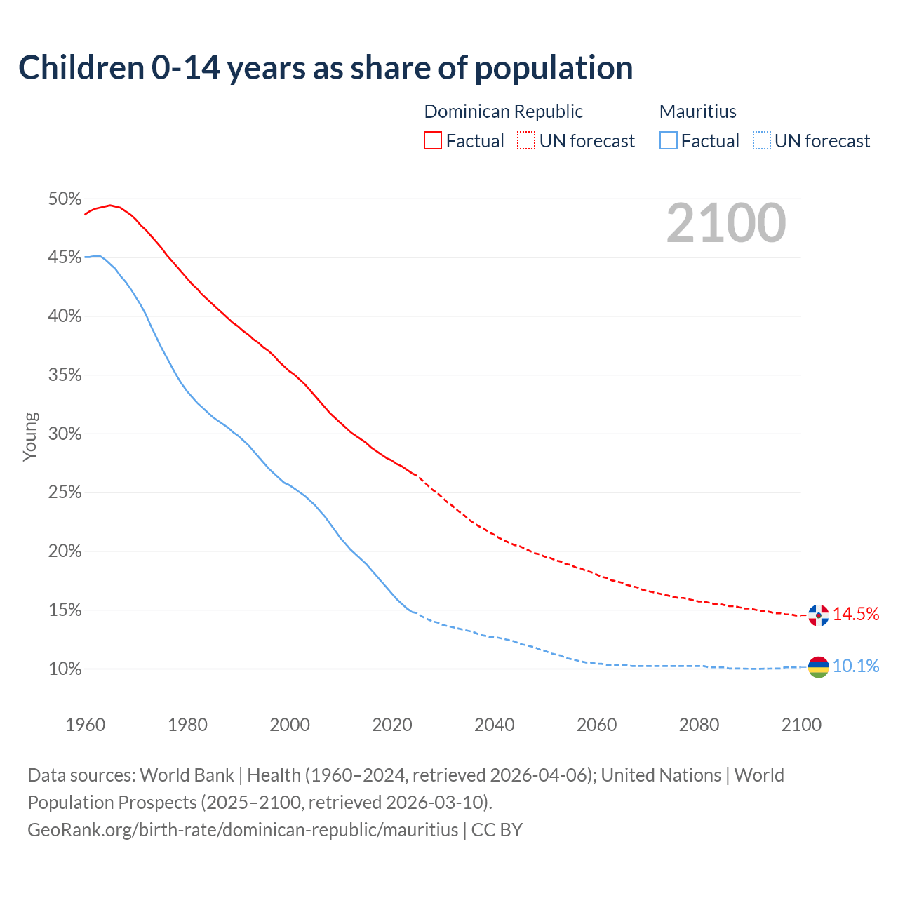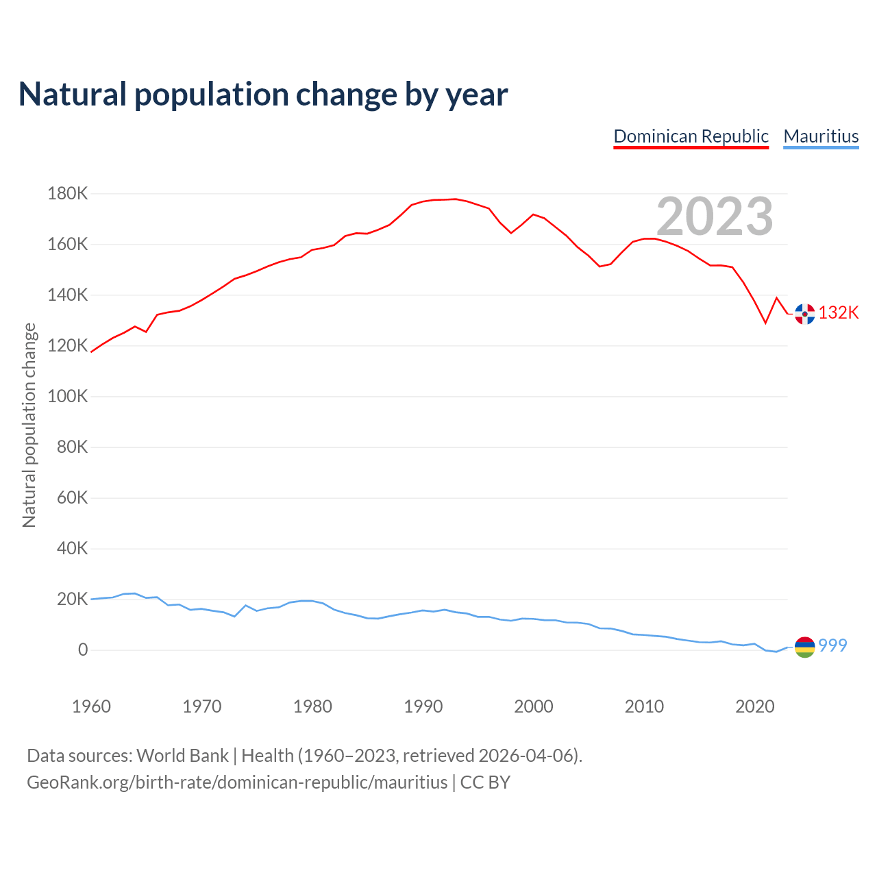 According to the latest available data on birth rates, the fertility rate in the Dominican Republic was 2.24 children per woman in 2023, compared to 1.39 in Mauritius in 2023. The replacement level is considered to be 2.1 children per woman.