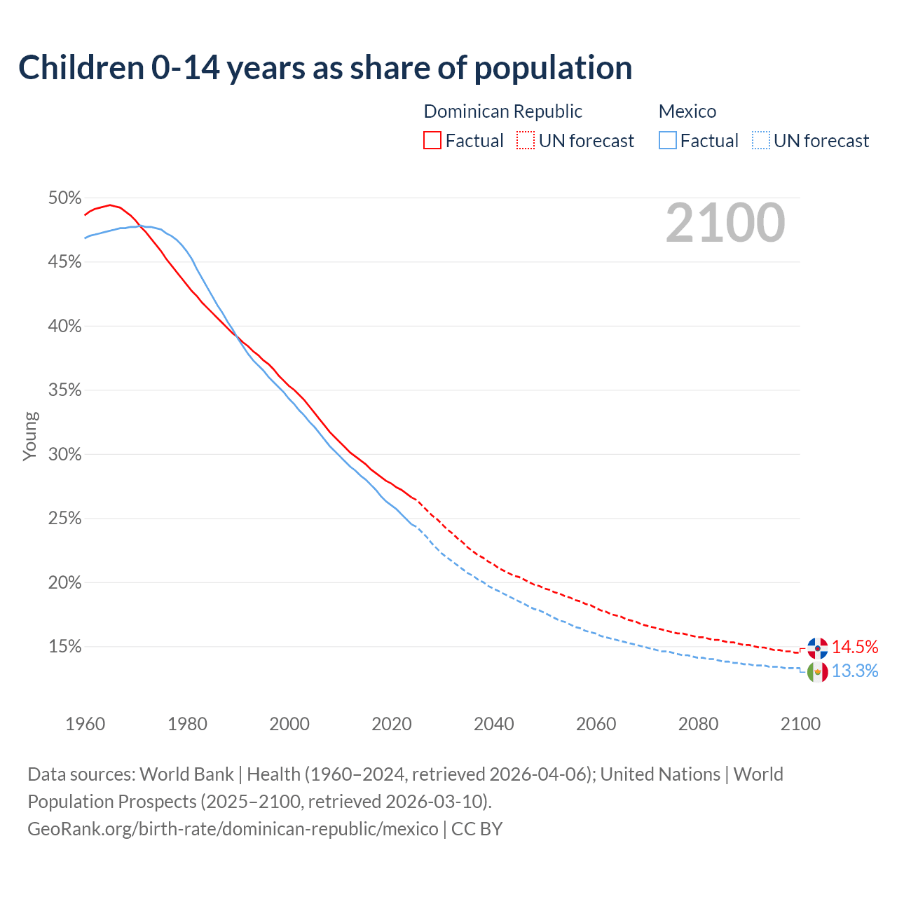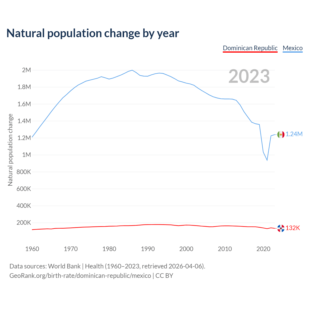 According to the latest available data on birth rates, the fertility rate in the Dominican Republic was 2.24 children per woman in 2023, compared to 1.91 in Mexico in 2023. The replacement level is considered to be 2.1 children per woman.
