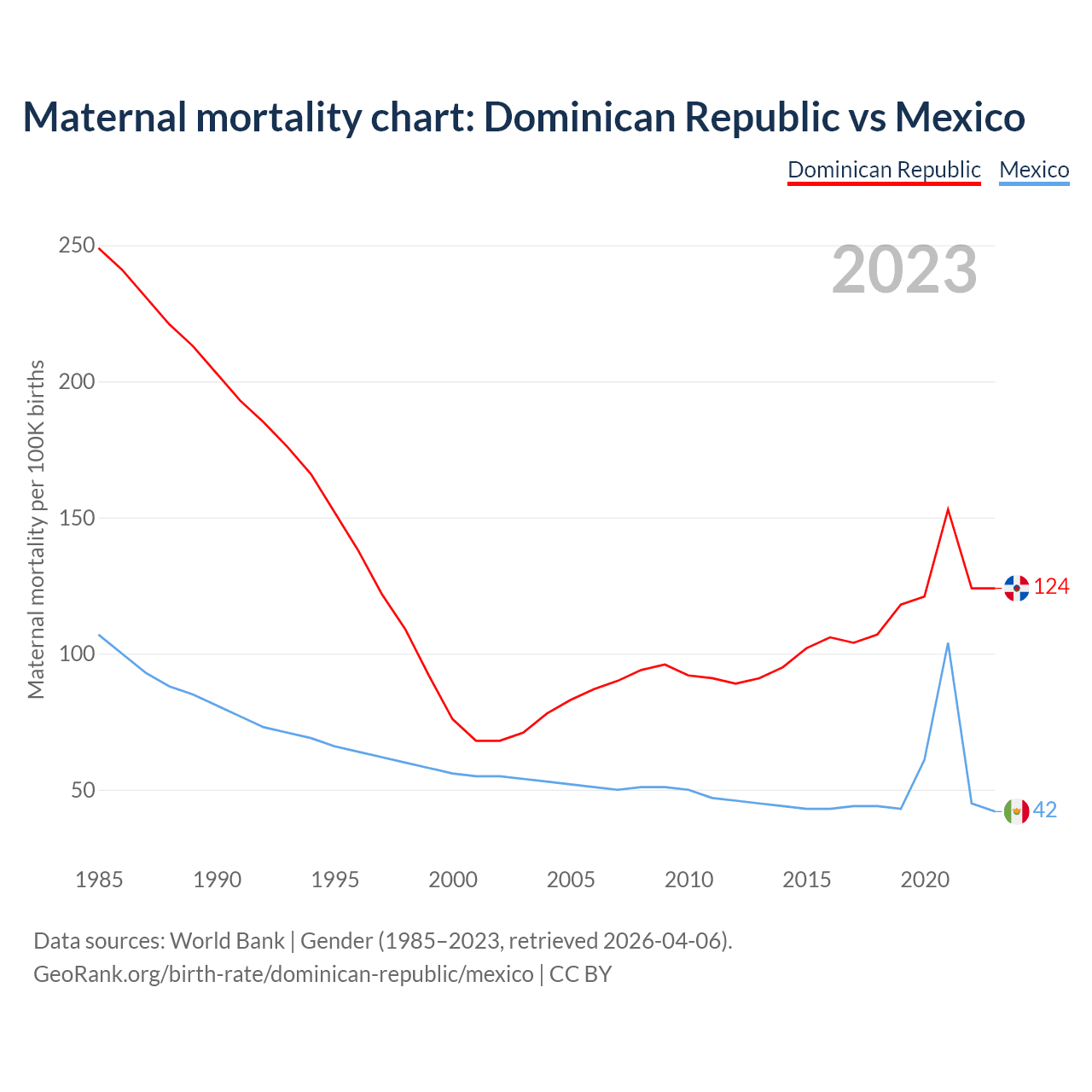The maternal mortality rate, which is the probability of dying during childbirth or within 42 days of pregnancy termination, is 124 deaths per 100,000 live births in the Dominican Republic, compared to 42 deaths in Mexico.