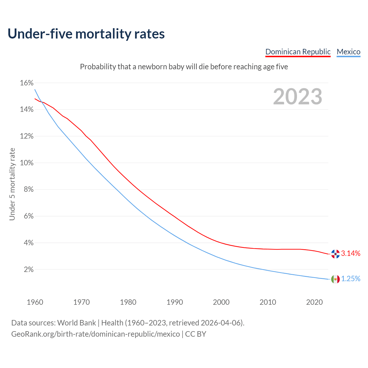 The chance that a newborn baby will die before reaching age five is 3.14% in the Dominican Republic and 1.25% in Mexico. Above is a chart with historical data on under-five mortality rates.