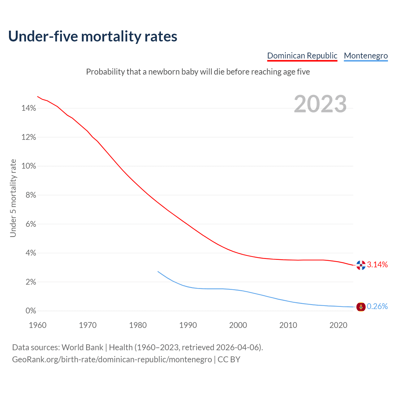 The chance that a newborn baby will die before reaching age five is 3.14% in the Dominican Republic and 0.26% in Montenegro. Above is a chart with historical data on under-five mortality rates.
