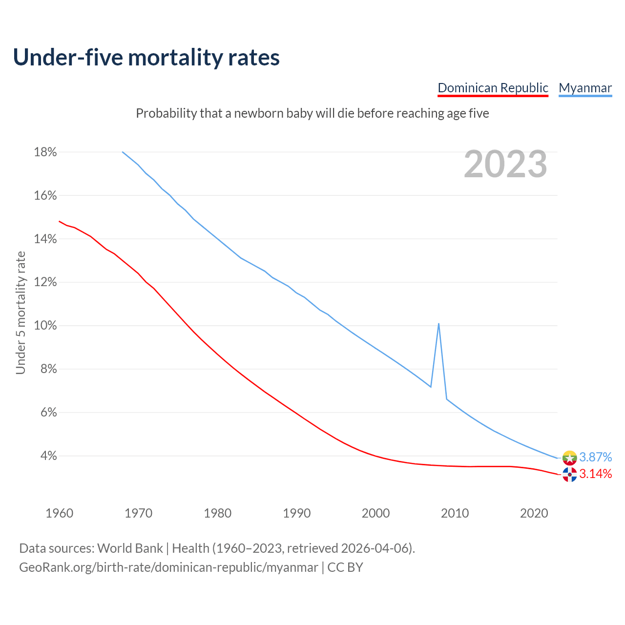 The chance that a newborn baby will die before reaching age five is 3.14% in the Dominican Republic and 3.87% in Myanmar. Above is a chart with historical data on under-five mortality rates.