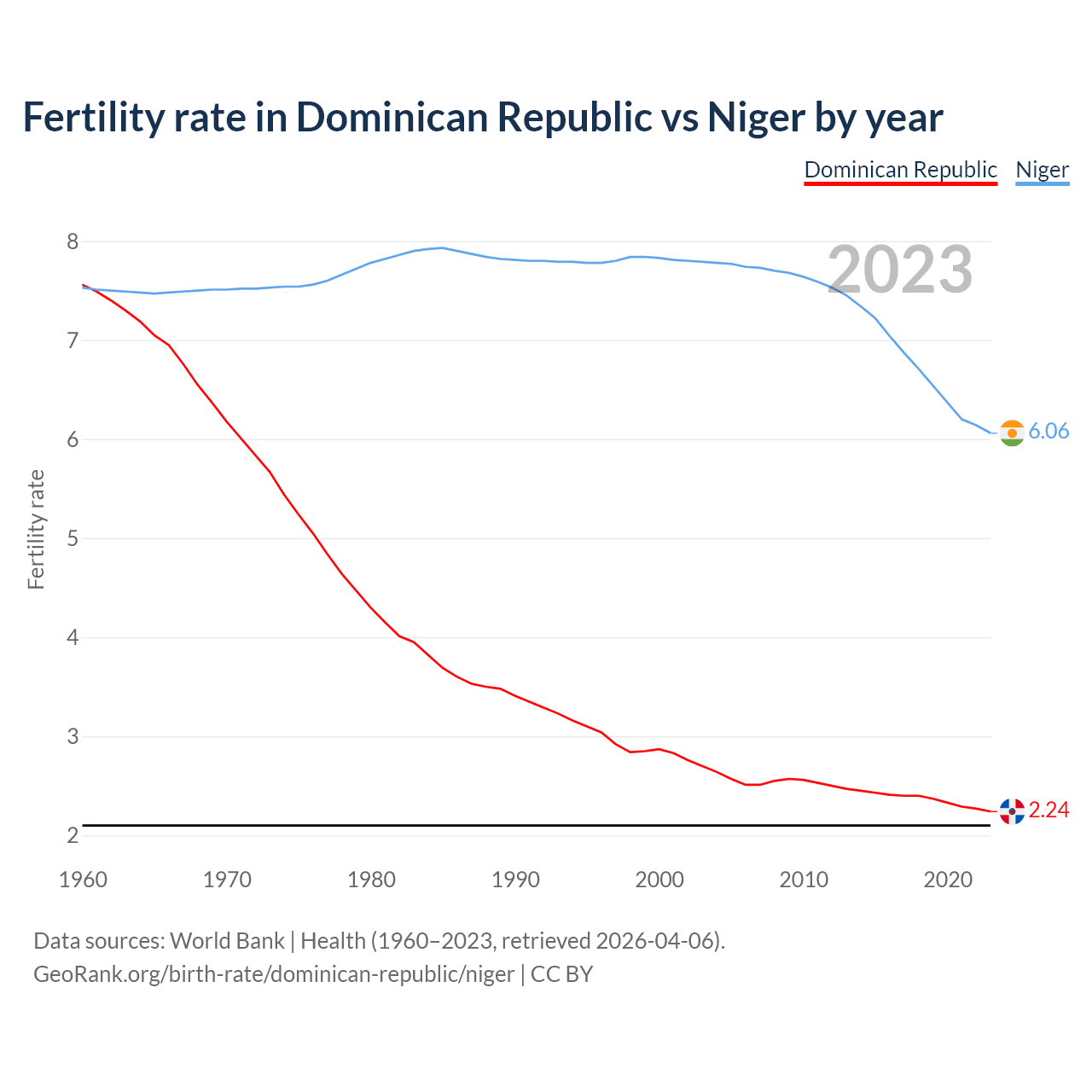 1960 vs 2023, the fertility rate has decreased by 70.3% in the Dominican Republic and by 19.5% in Niger — in 1960, it was 7.56 and 7.53, respectively.