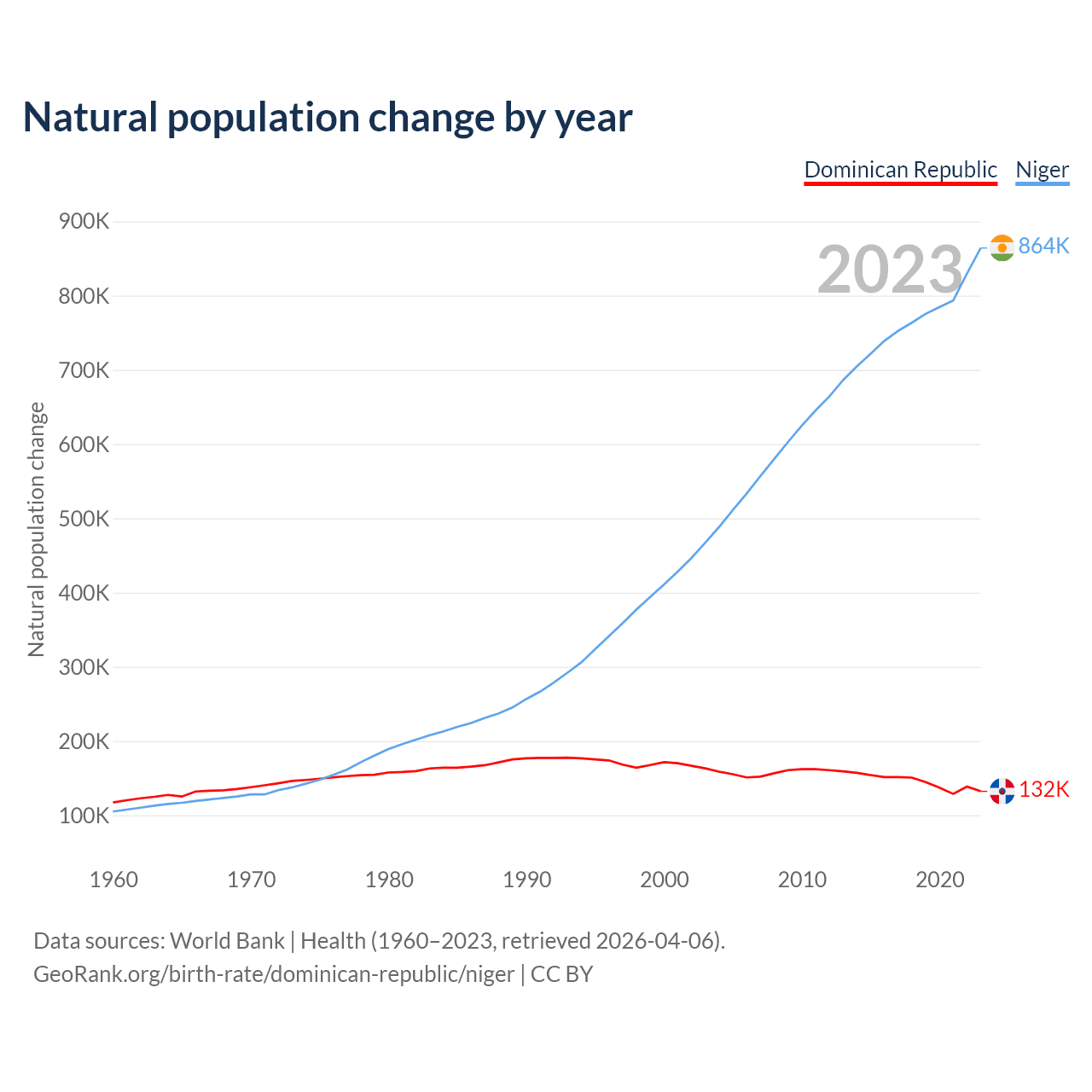 Check the Dominican Republic vs Niger population clock for a dynamic visualization of the changing population.