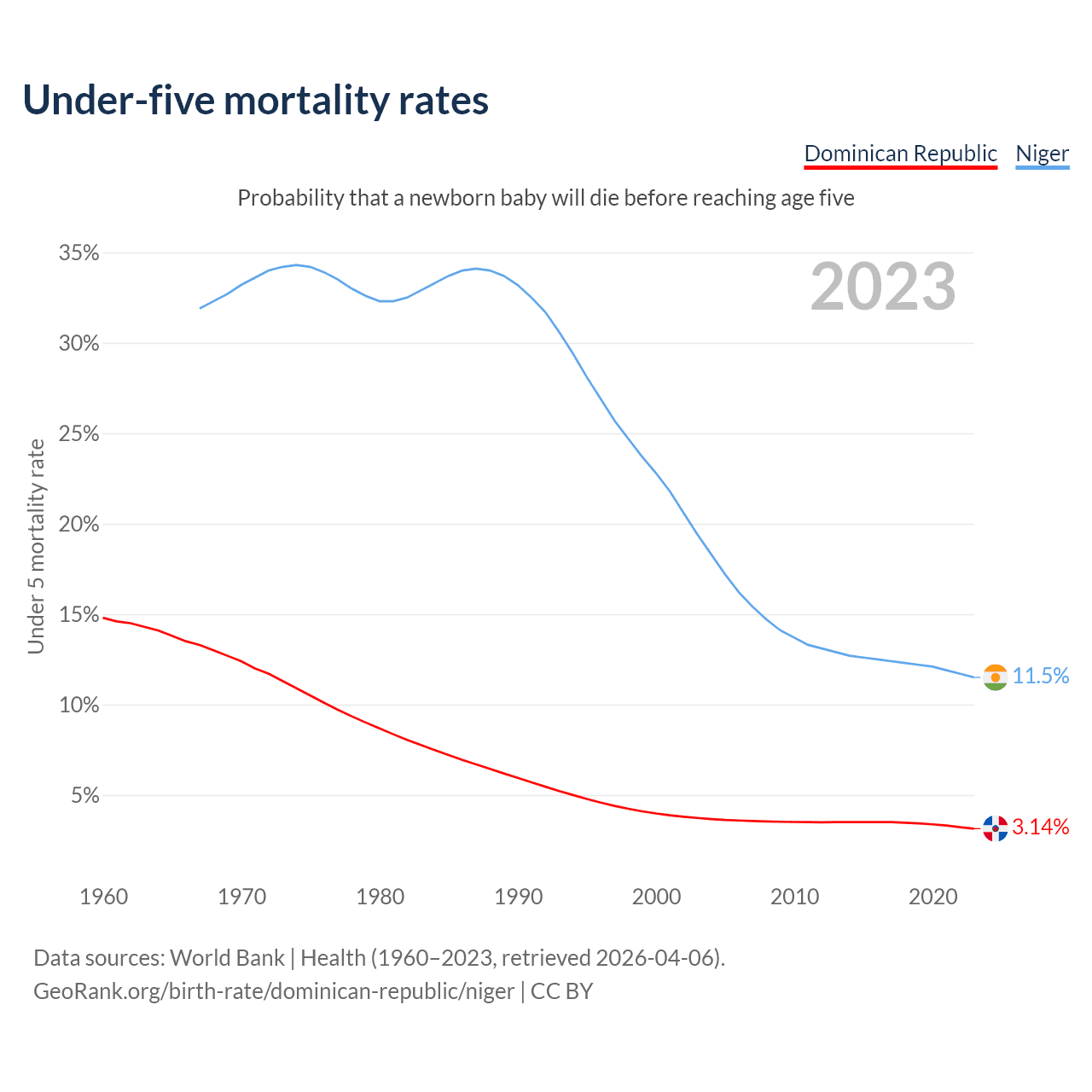 The chance that a newborn baby will die before reaching age five is 3.14% in the Dominican Republic and 11.5% in Niger. Above is a chart with historical data on under-five mortality rates.