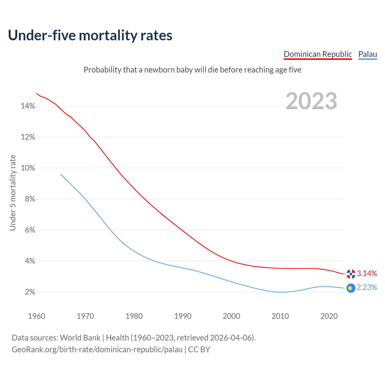 The chance that a newborn baby will die before reaching age five is 3.14% in the Dominican Republic and 2.23% in Palau. Above is a chart with historical data on under-five mortality rates.