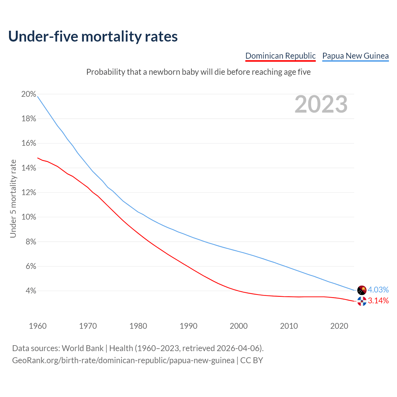 The chance that a newborn baby will die before reaching age five is 3.14% in the Dominican Republic and 4.03% in Papua New Guinea. Above is a chart with historical data on under-five mortality rates.