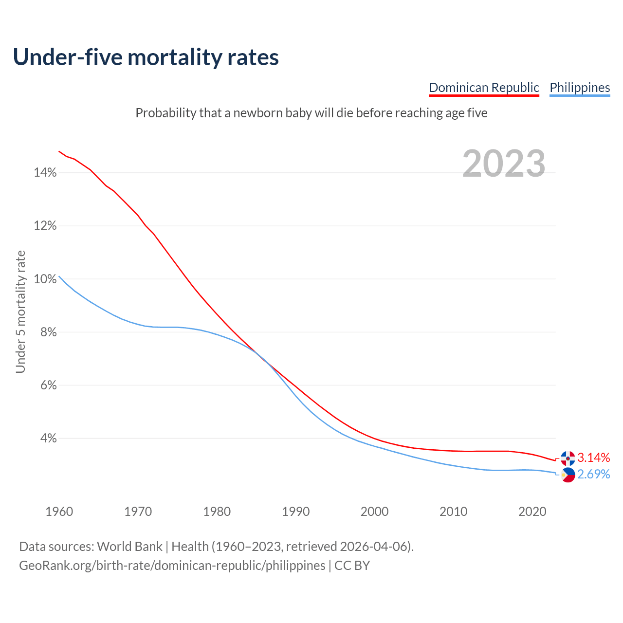 The chance that a newborn baby will die before reaching age five is 3.14% in the Dominican Republic and 2.69% in the Philippines. Above is a chart with historical data on under-five mortality rates.