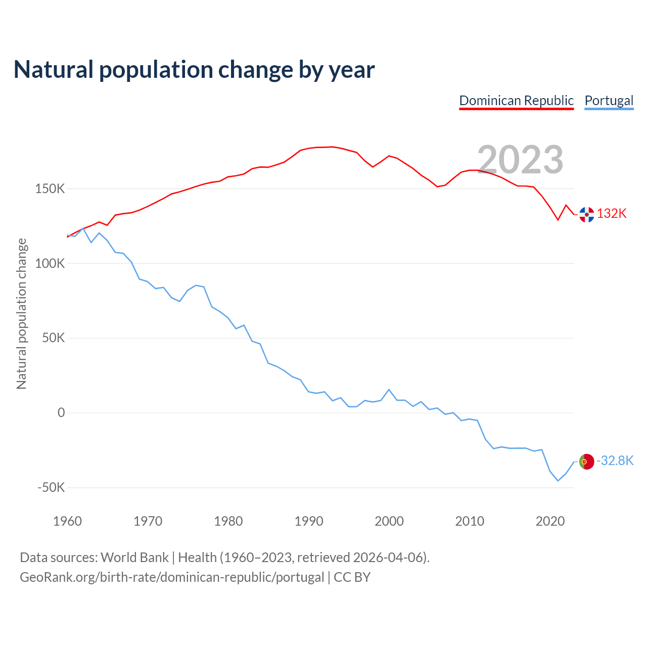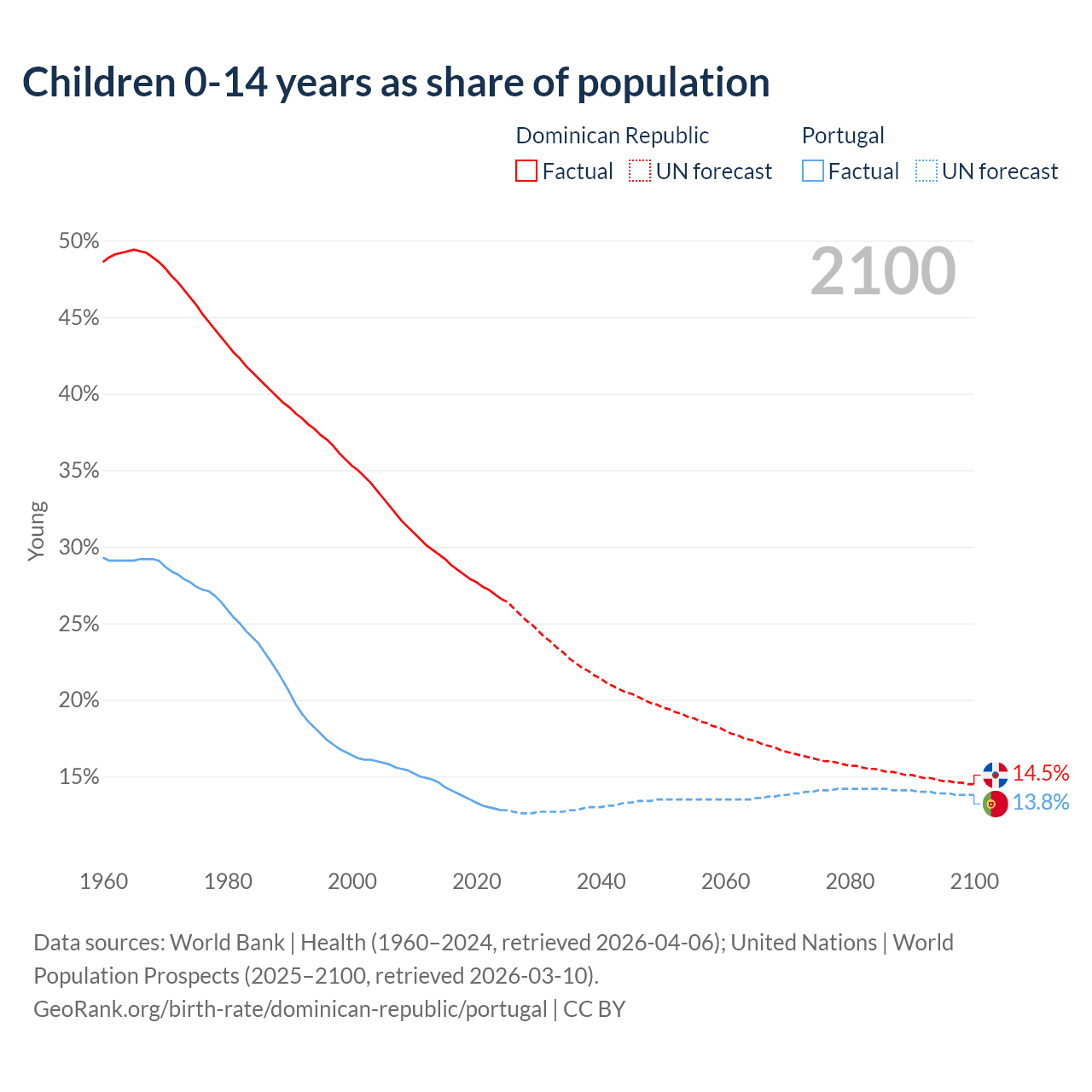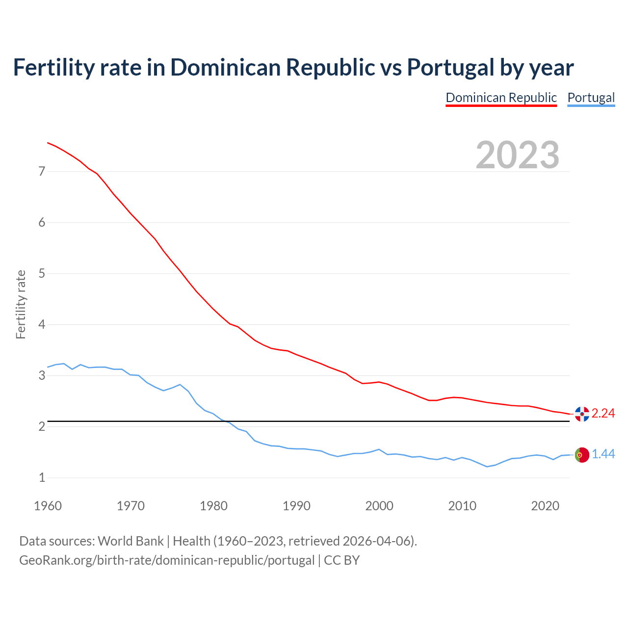 According to the latest available data on birth rates, the fertility rate in the Dominican Republic was 2.24 children per woman in 2023, compared to 1.44 in Portugal in 2023. The replacement level is considered to be 2.1 children per woman.