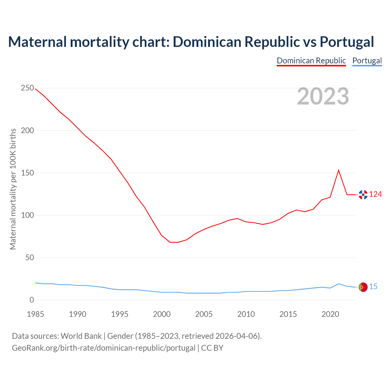 The maternal mortality rate, which is the probability of dying during childbirth or within 42 days of pregnancy termination, is 124 deaths per 100,000 live births in the Dominican Republic, compared to 15 deaths in Portugal.