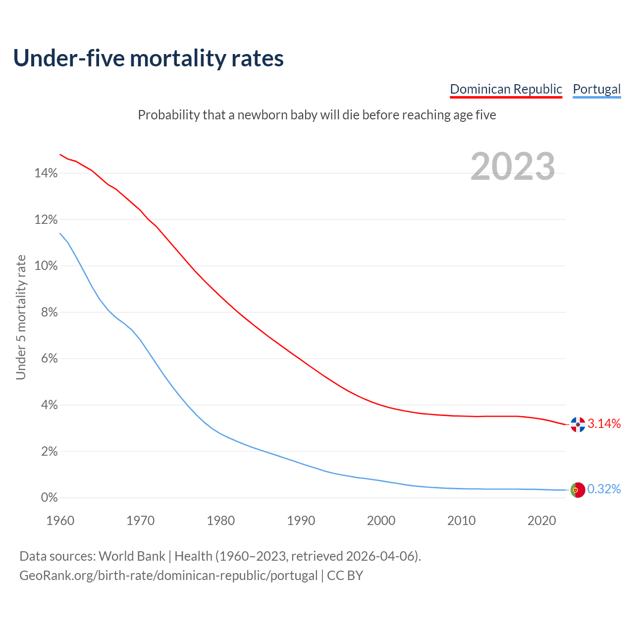 The chance that a newborn baby will die before reaching age five is 3.14% in the Dominican Republic and 0.32% in Portugal. Above is a chart with historical data on under-five mortality rates.