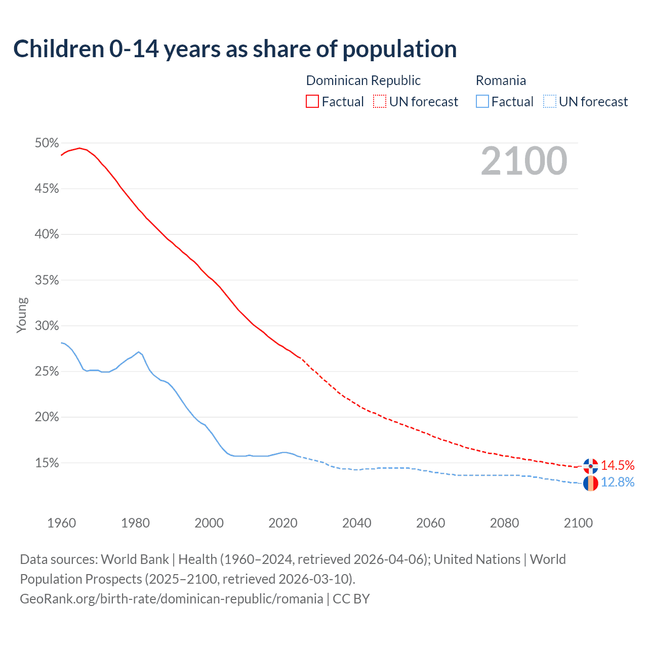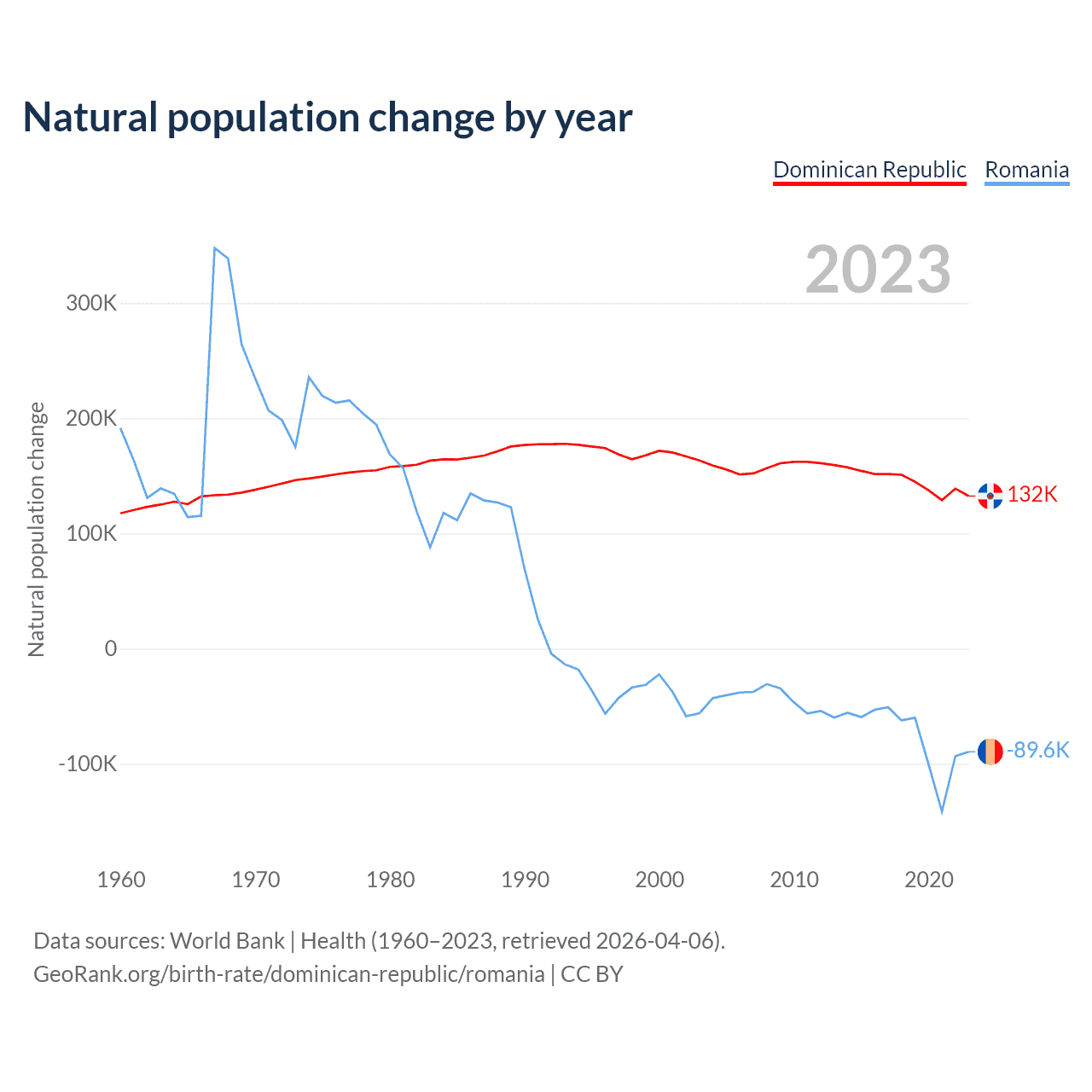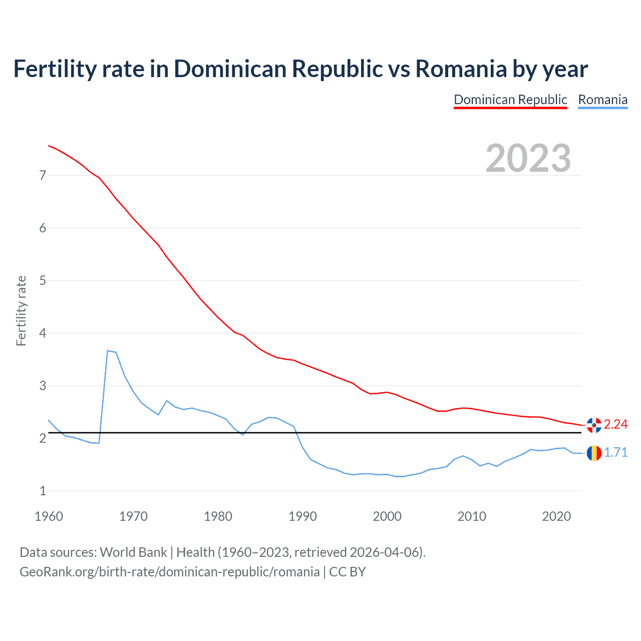 According to the latest available data on birth rates, the fertility rate in the Dominican Republic was 2.24 children per woman in 2023, compared to 1.71 in Romania in 2023. The replacement level is considered to be 2.1 children per woman.