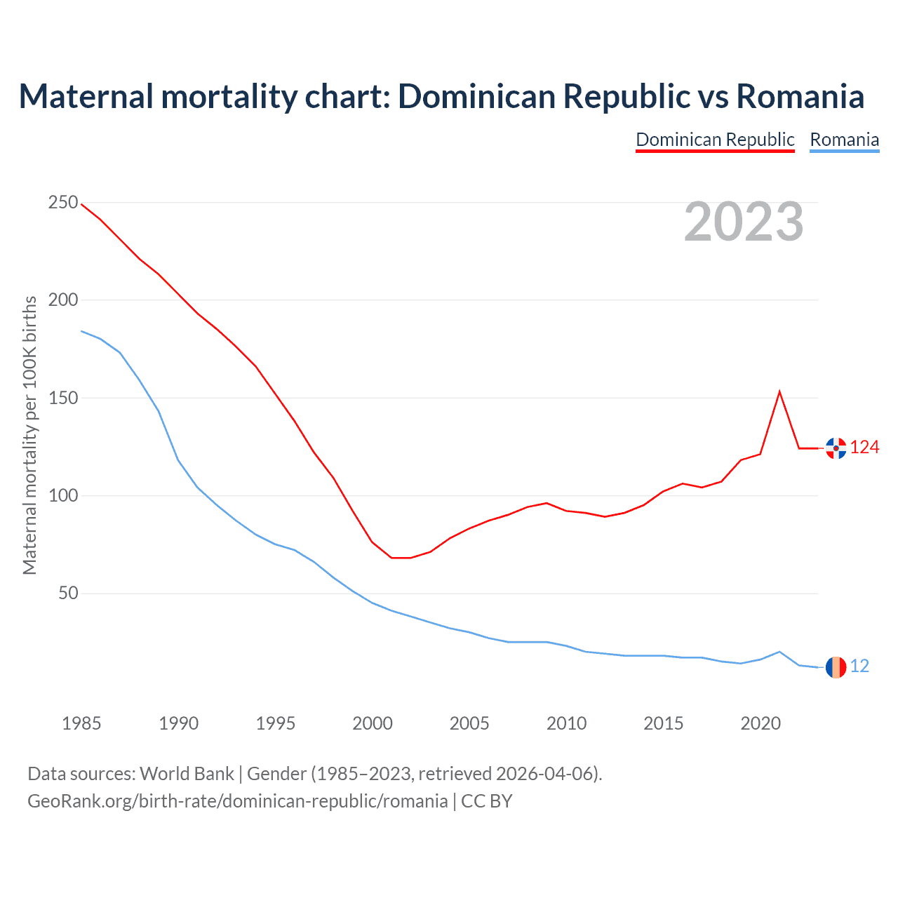 The maternal mortality rate, which is the probability of dying during childbirth or within 42 days of pregnancy termination, is 124 deaths per 100,000 live births in the Dominican Republic, compared to 12 deaths in Romania.