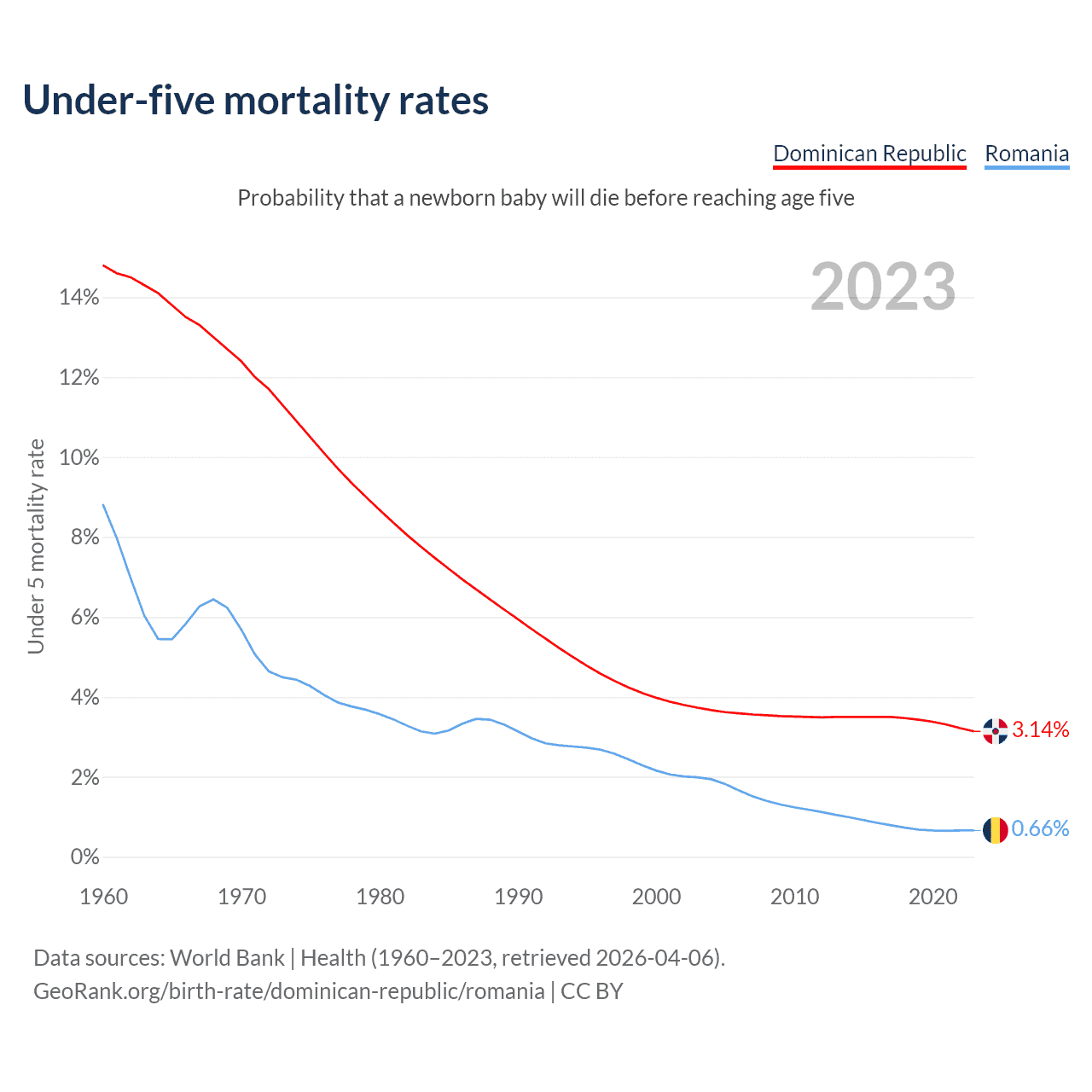 The chance that a newborn baby will die before reaching age five is 3.14% in the Dominican Republic and 0.66% in Romania. Above is a chart with historical data on under-five mortality rates.