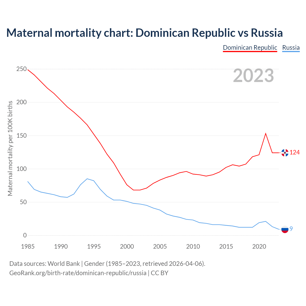 The maternal mortality rate, which is the probability of dying during childbirth or within 42 days of pregnancy termination, is 124 deaths per 100,000 live births in the Dominican Republic, compared to 9 deaths in Russia.
