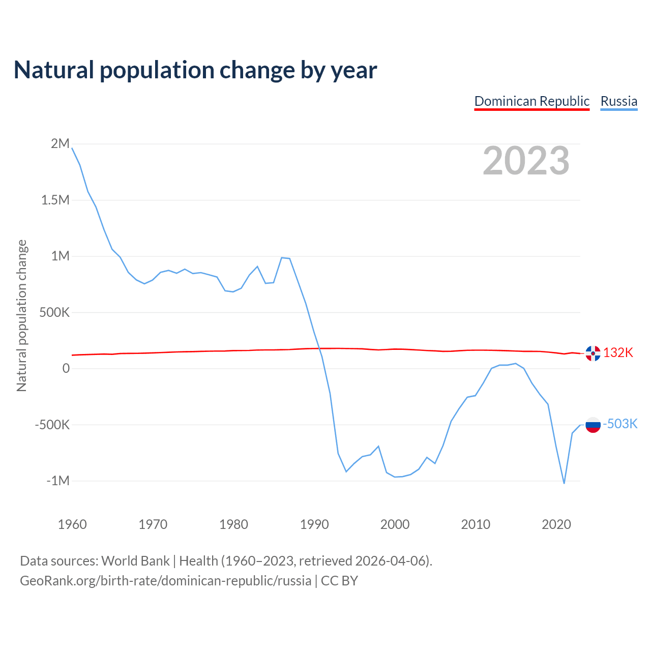 According to the latest available data on birth rates, the fertility rate in the Dominican Republic was 2.24 children per woman in 2023, compared to 1.41 in Russia in 2023. The replacement level is considered to be 2.1 children per woman.
