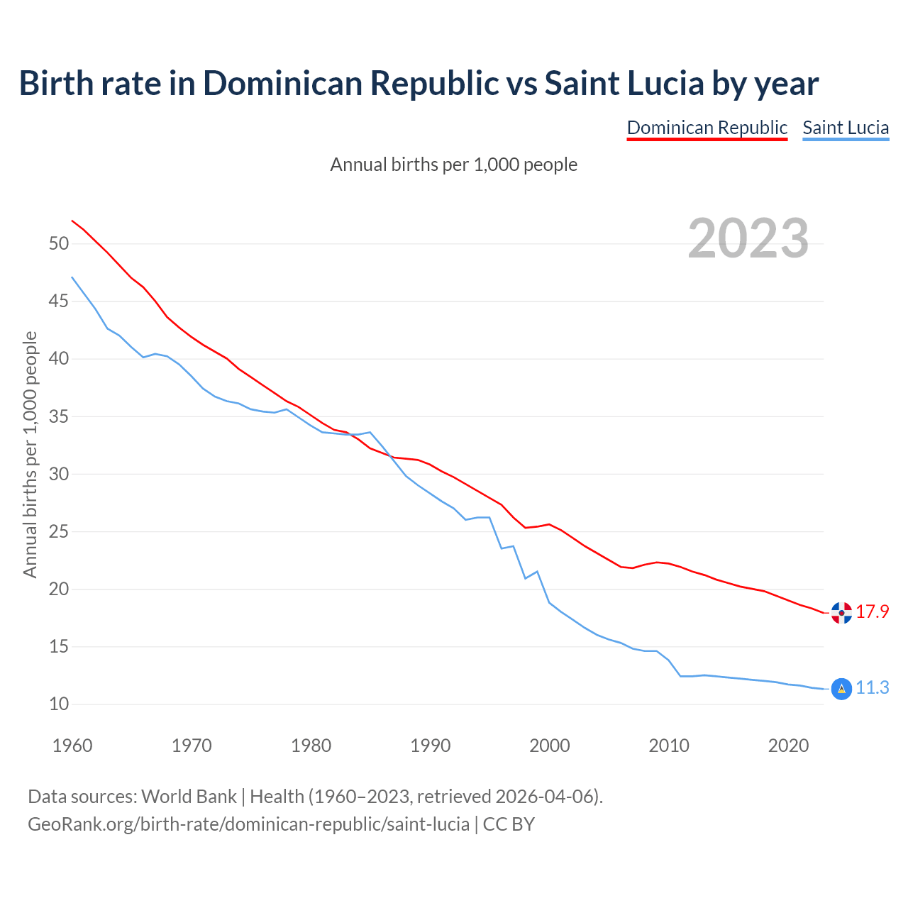 The Dominican Republic has an annual birth rate of 17.9 births per 1,000 people, compared to 11.3 for Saint Lucia. The average number of children a woman is expected to have during her lifetime — the fertility rate, is 2.24 in the Dominican Republic and 1.38 in Saint Lucia — 38.5% difference.