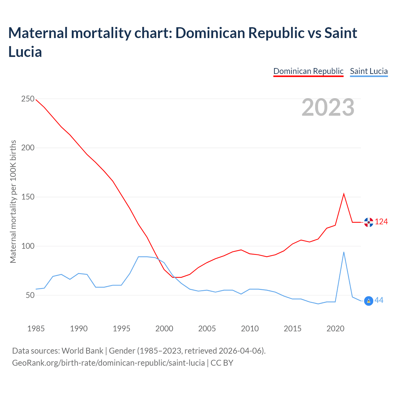 The maternal mortality rate, which is the probability of dying during childbirth or within 42 days of pregnancy termination, is 124 deaths per 100,000 live births in the Dominican Republic, compared to 44 deaths in Saint Lucia.