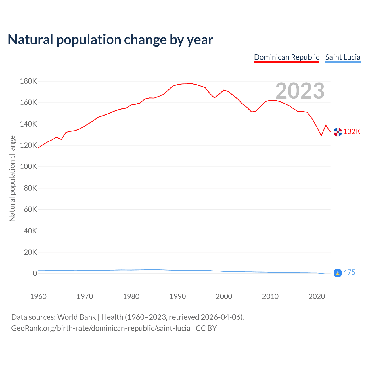 According to the latest available data on birth rates, the fertility rate in the Dominican Republic was 2.24 children per woman in 2023, compared to 1.38 in Saint Lucia in 2023. The replacement level is considered to be 2.1 children per woman.