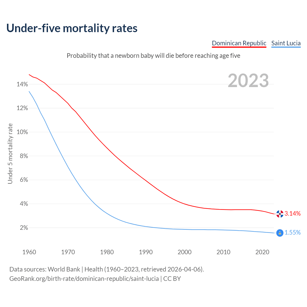 The chance that a newborn baby will die before reaching age five is 3.14% in the Dominican Republic and 1.55% in Saint Lucia. Above is a chart with historical data on under-five mortality rates.