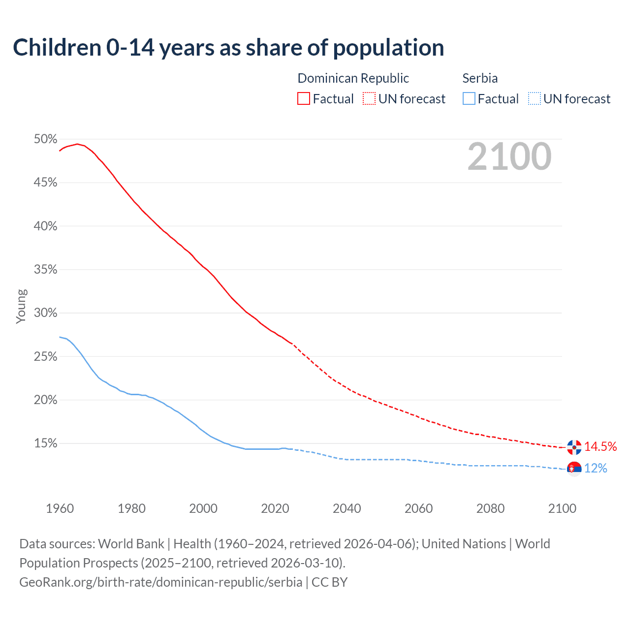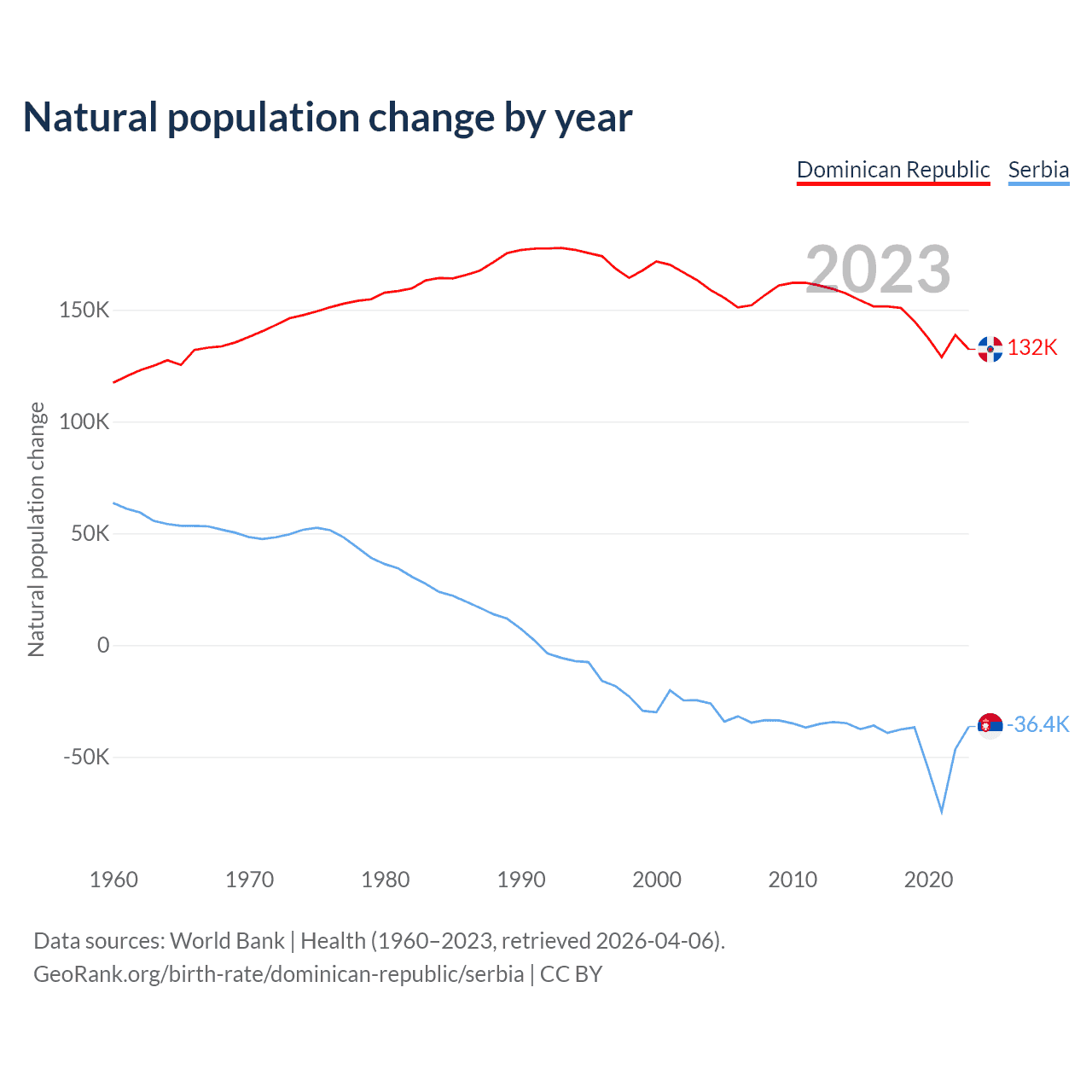 According to the latest available data on birth rates, the fertility rate in the Dominican Republic was 2.24 children per woman in 2023, compared to 1.61 in Serbia in 2023. The replacement level is considered to be 2.1 children per woman.