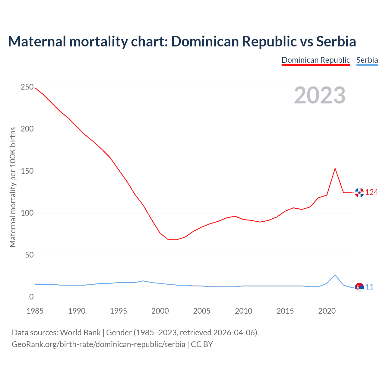 The maternal mortality rate, which is the probability of dying during childbirth or within 42 days of pregnancy termination, is 124 deaths per 100,000 live births in the Dominican Republic, compared to 11 deaths in Serbia.