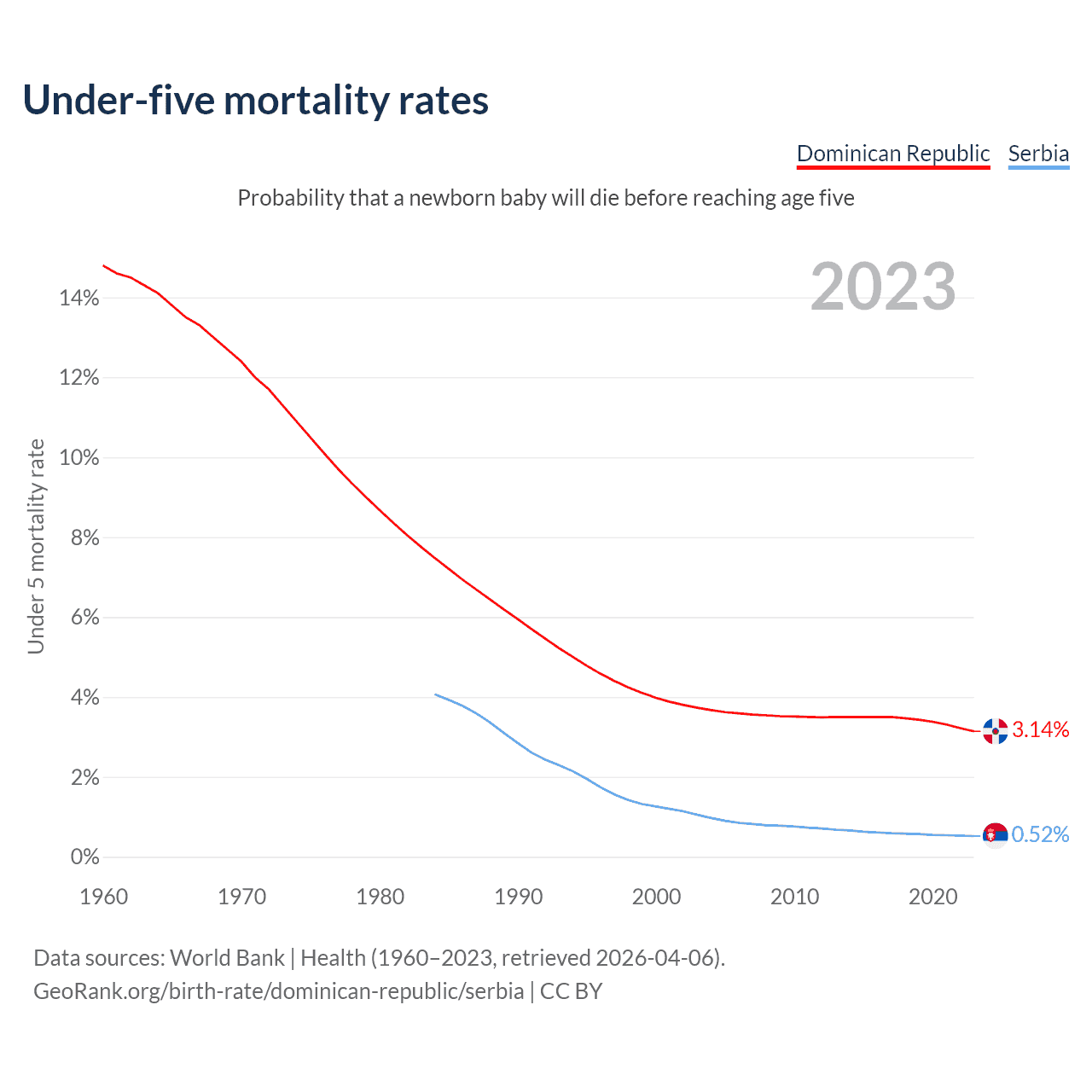 The chance that a newborn baby will die before reaching age five is 3.14% in the Dominican Republic and 0.52% in Serbia. Above is a chart with historical data on under-five mortality rates.