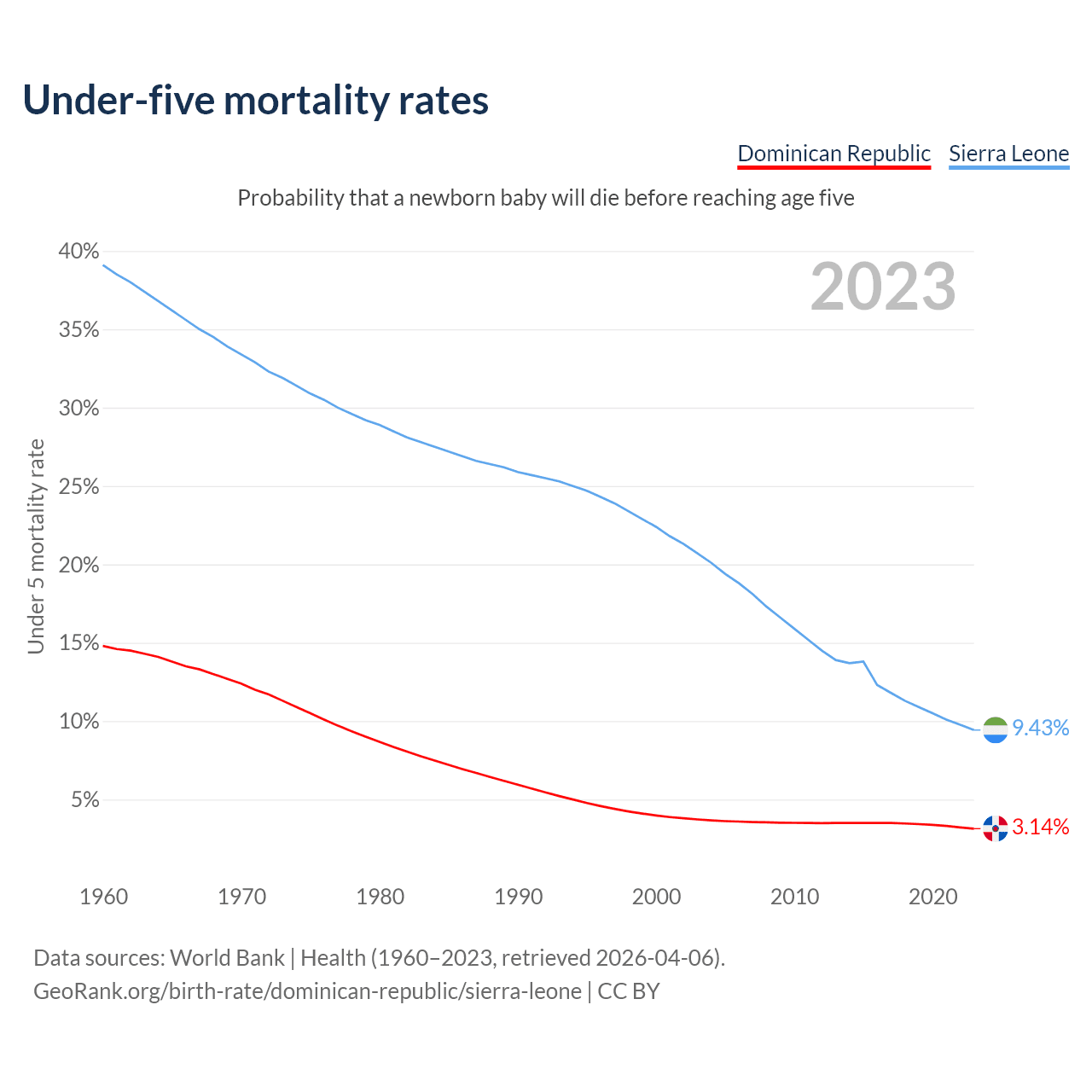 The chance that a newborn baby will die before reaching age five is 3.14% in the Dominican Republic and 9.43% in Sierra Leone. Above is a chart with historical data on under-five mortality rates.