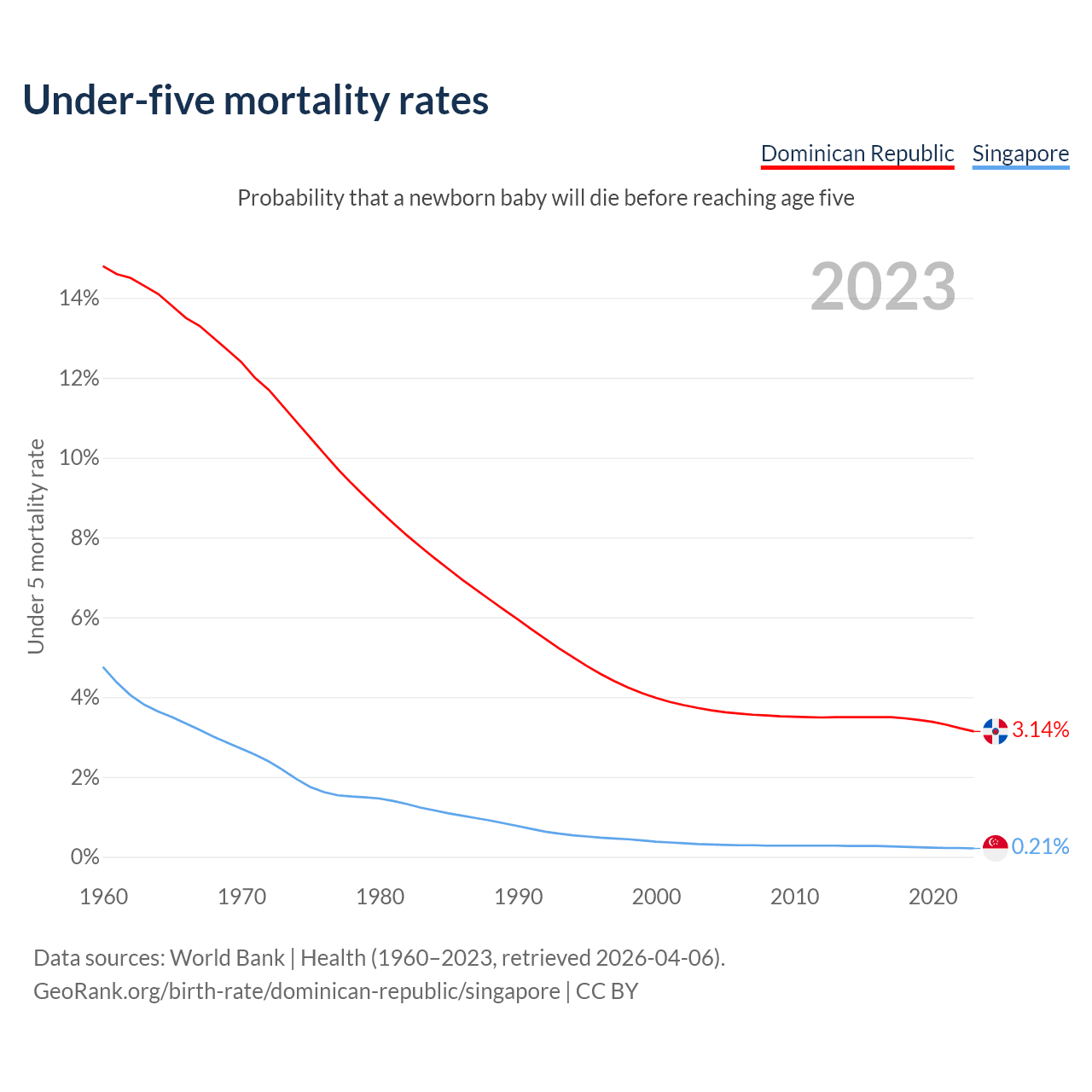 The chance that a newborn baby will die before reaching age five is 3.14% in the Dominican Republic and 0.21% in Singapore. Above is a chart with historical data on under-five mortality rates.