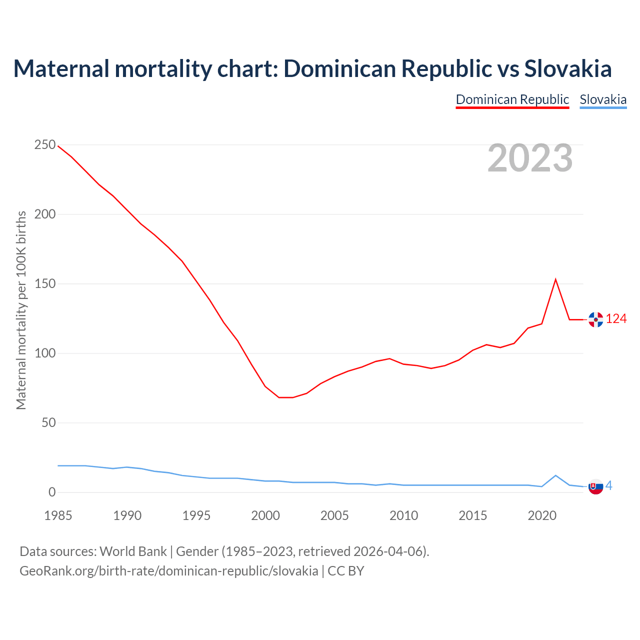 The maternal mortality rate, which is the probability of dying during childbirth or within 42 days of pregnancy termination, is 124 deaths per 100,000 live births in the Dominican Republic, compared to 4 deaths in Slovakia.