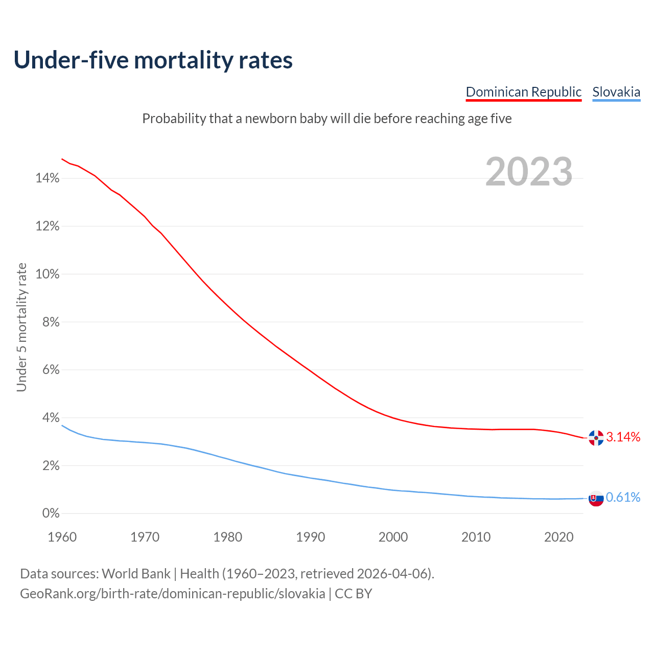 The chance that a newborn baby will die before reaching age five is 3.14% in the Dominican Republic and 0.61% in Slovakia. Above is a chart with historical data on under-five mortality rates.