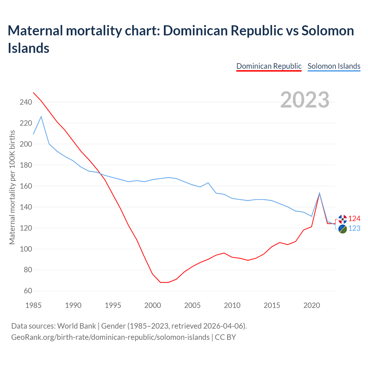 The maternal mortality rate, which is the probability of dying during childbirth or within 42 days of pregnancy termination, is 124 deaths per 100,000 live births in the Dominican Republic, compared to 123 deaths in the Solomon Islands.