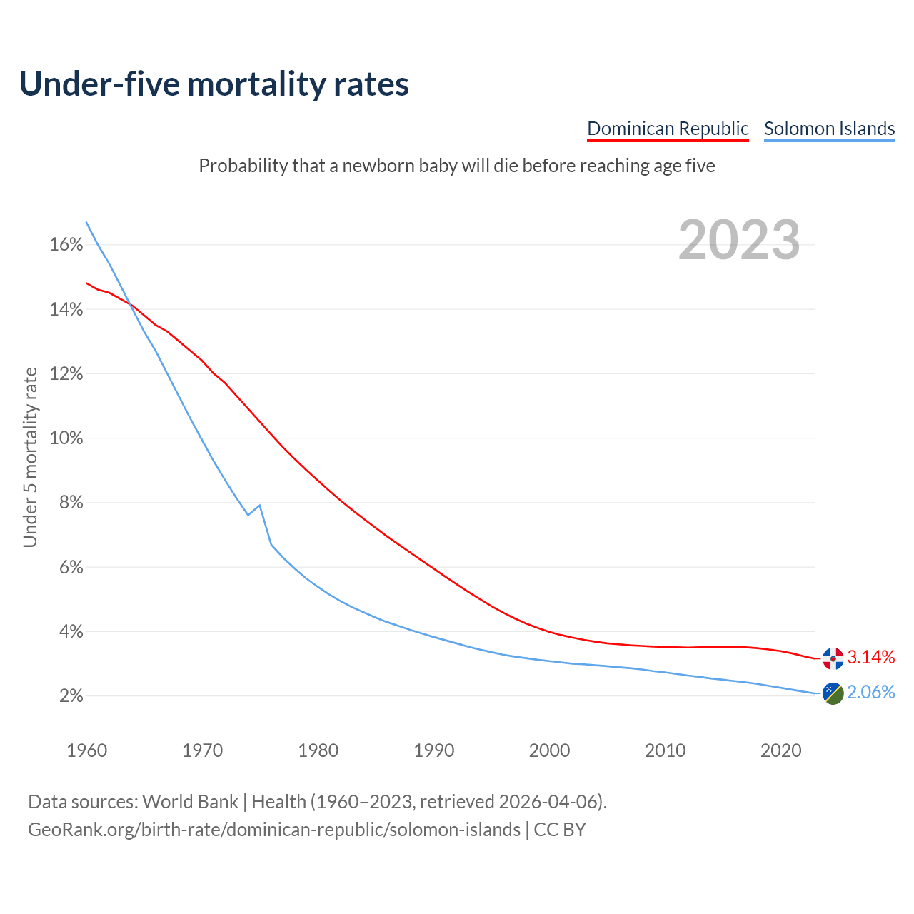 The chance that a newborn baby will die before reaching age five is 3.14% in the Dominican Republic and 2.06% in the Solomon Islands. Above is a chart with historical data on under-five mortality rates.