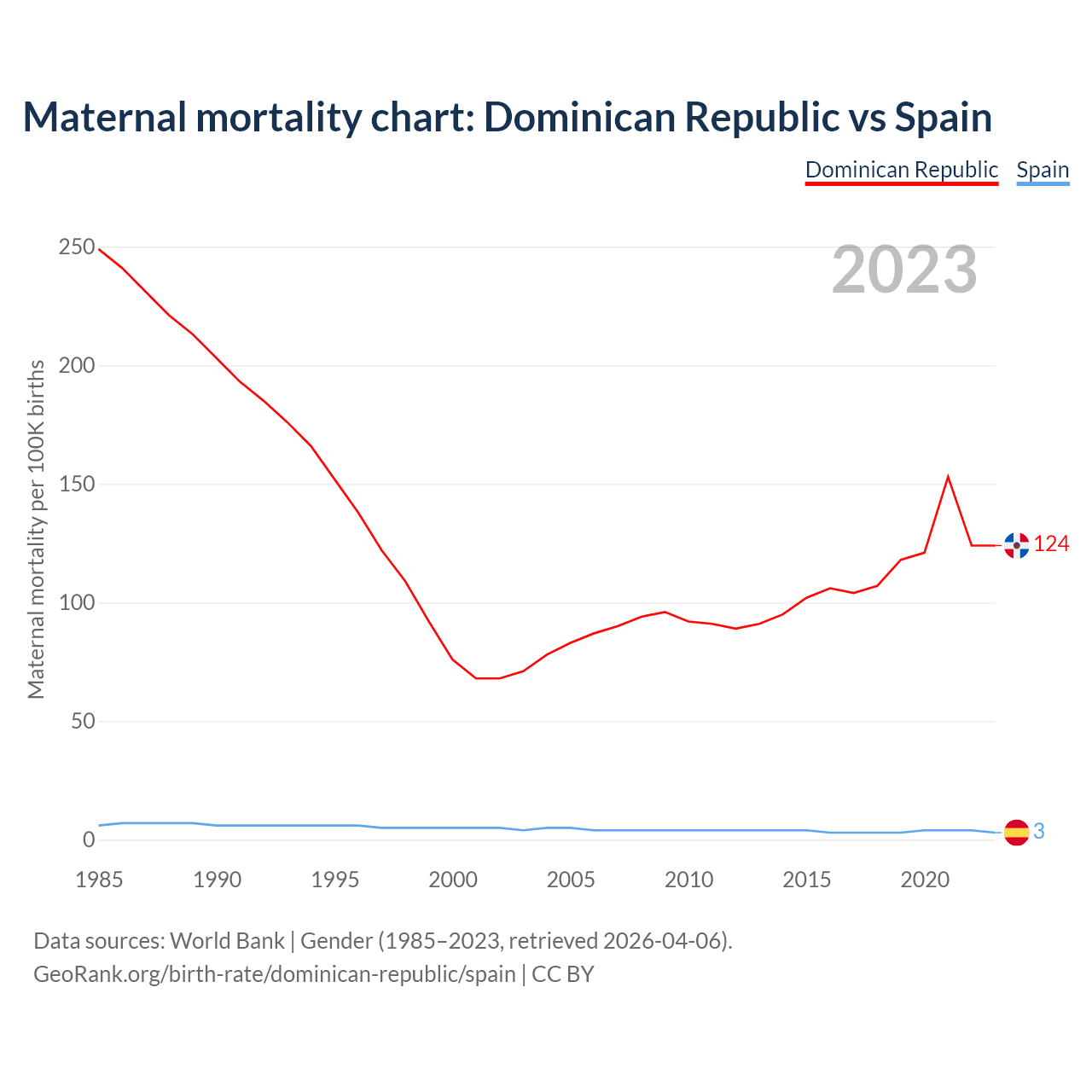 The maternal mortality rate, which is the probability of dying during childbirth or within 42 days of pregnancy termination, is 124 deaths per 100,000 live births in the Dominican Republic, compared to 3 deaths in Spain.