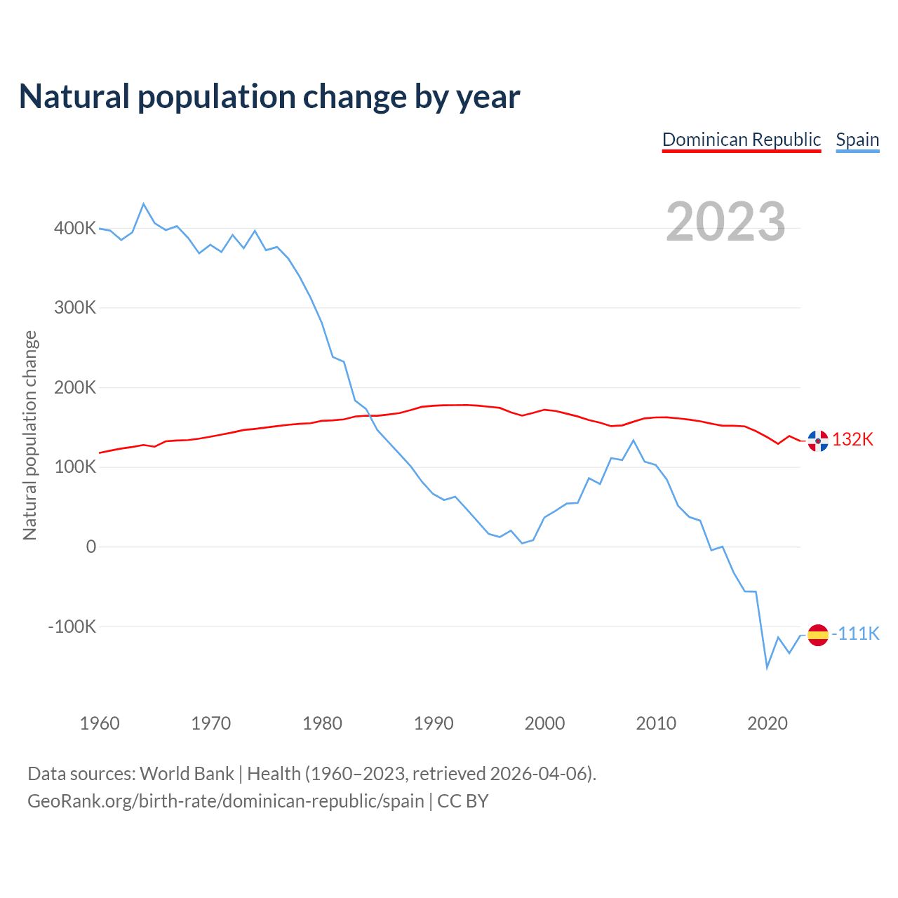 According to the latest available data on birth rates, the fertility rate in the Dominican Republic was 2.24 children per woman in 2023, compared to 1.12 in Spain in 2023. The replacement level is considered to be 2.1 children per woman.