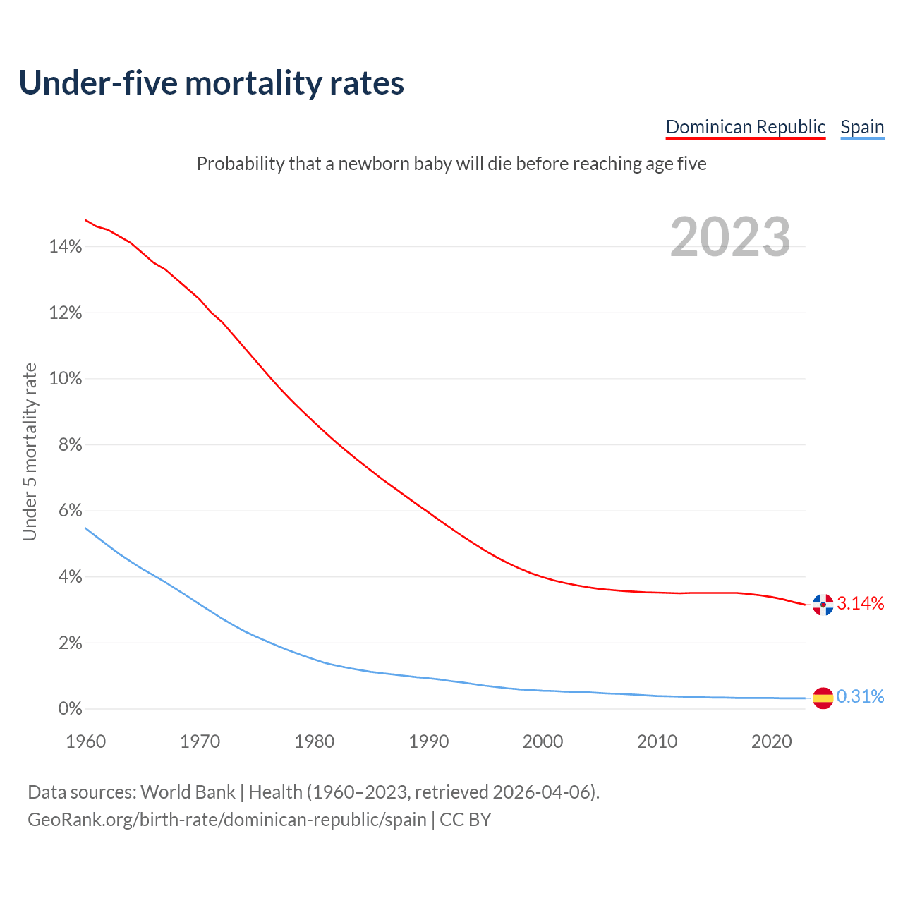 The chance that a newborn baby will die before reaching age five is 3.14% in the Dominican Republic and 0.31% in Spain. Above is a chart with historical data on under-five mortality rates.