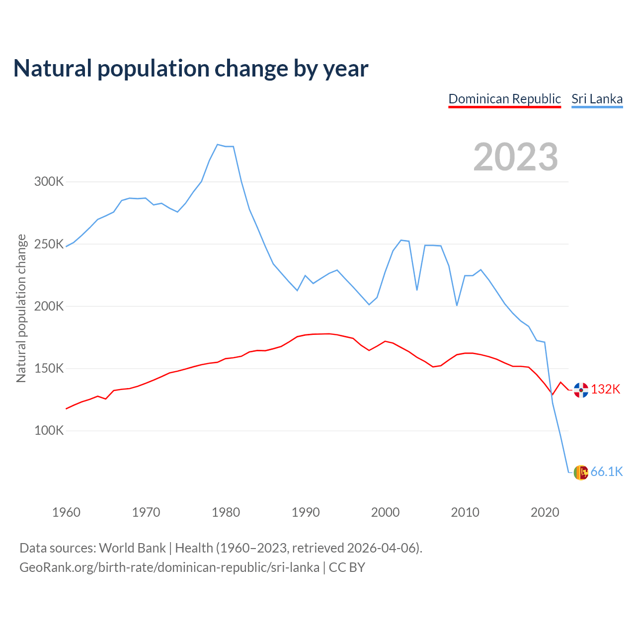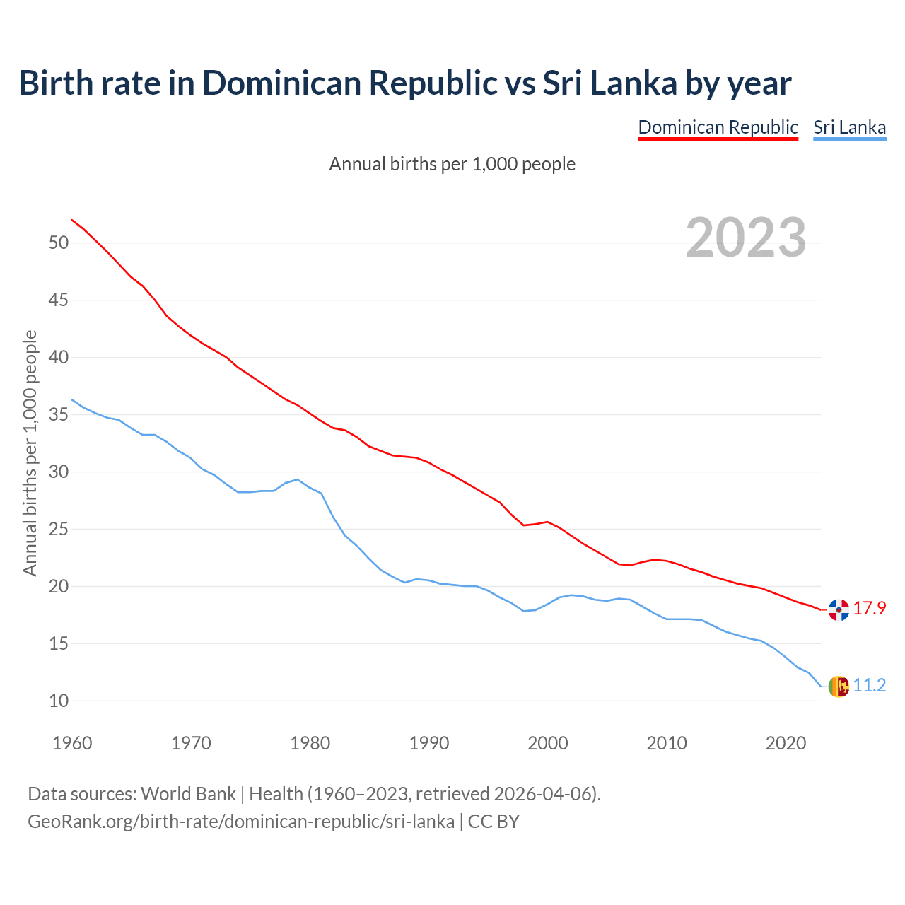 The Dominican Republic has an annual birth rate of 17.9 births per 1,000 people, compared to 11.2 for Sri Lanka. The average number of children a woman is expected to have during her lifetime — the fertility rate, is 2.24 in the Dominican Republic and 1.97 in Sri Lanka — 12% difference.