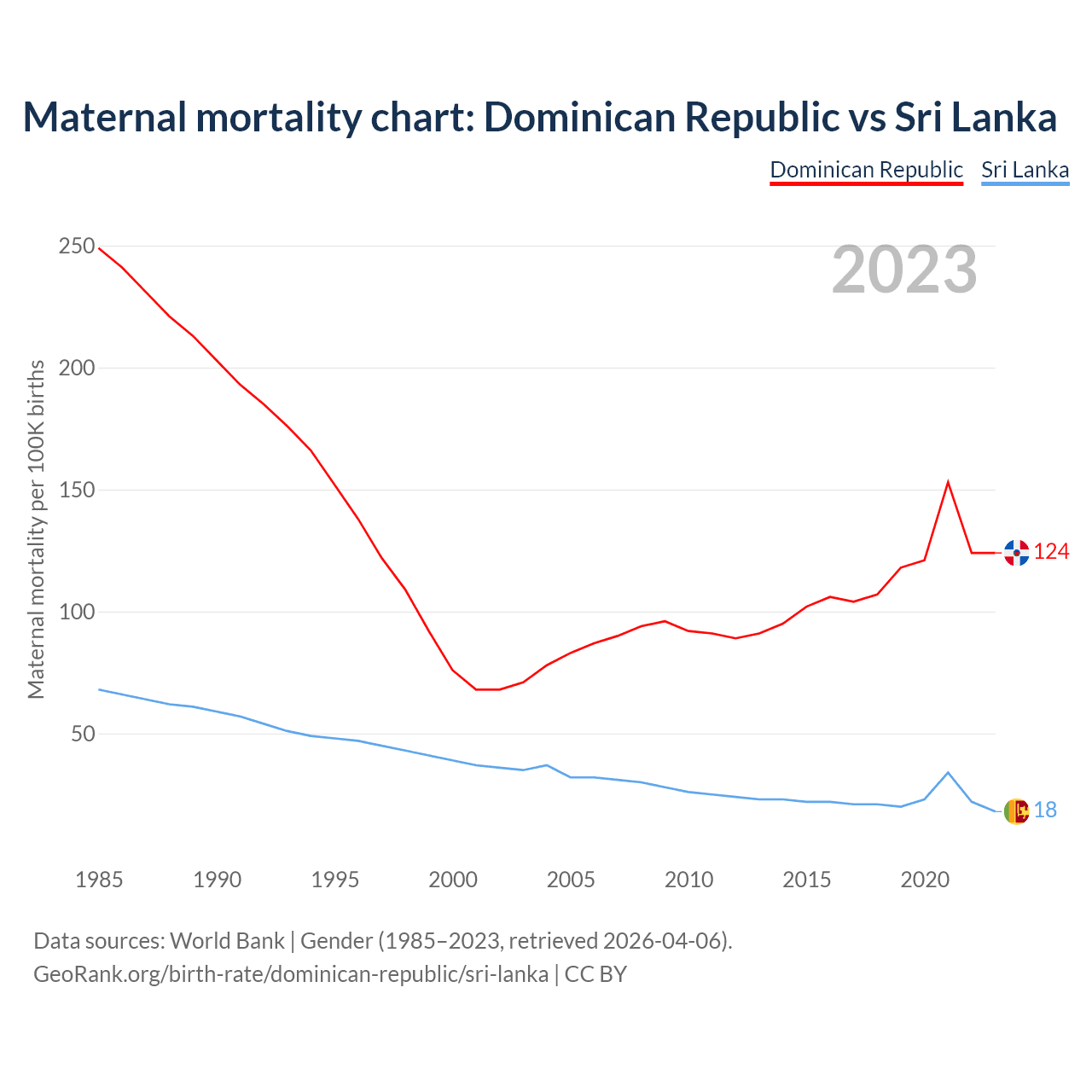 The maternal mortality rate, which is the probability of dying during childbirth or within 42 days of pregnancy termination, is 124 deaths per 100,000 live births in the Dominican Republic, compared to 18 deaths in Sri Lanka.