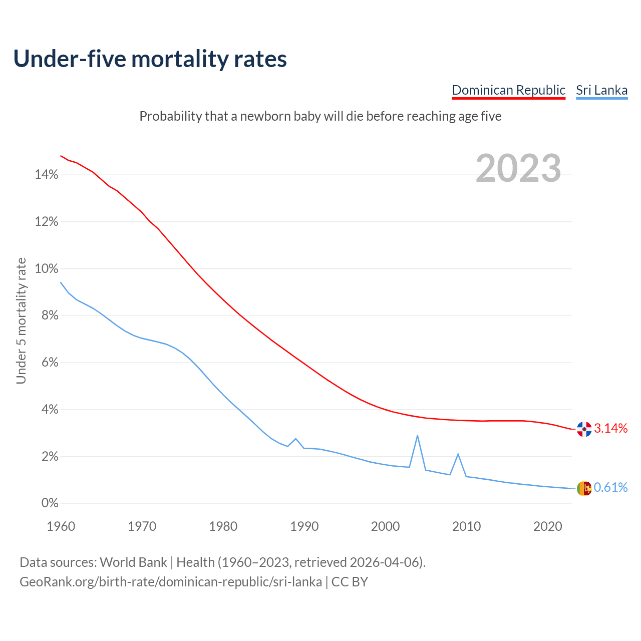 The chance that a newborn baby will die before reaching age five is 3.14% in the Dominican Republic and 0.61% in Sri Lanka. Above is a chart with historical data on under-five mortality rates.