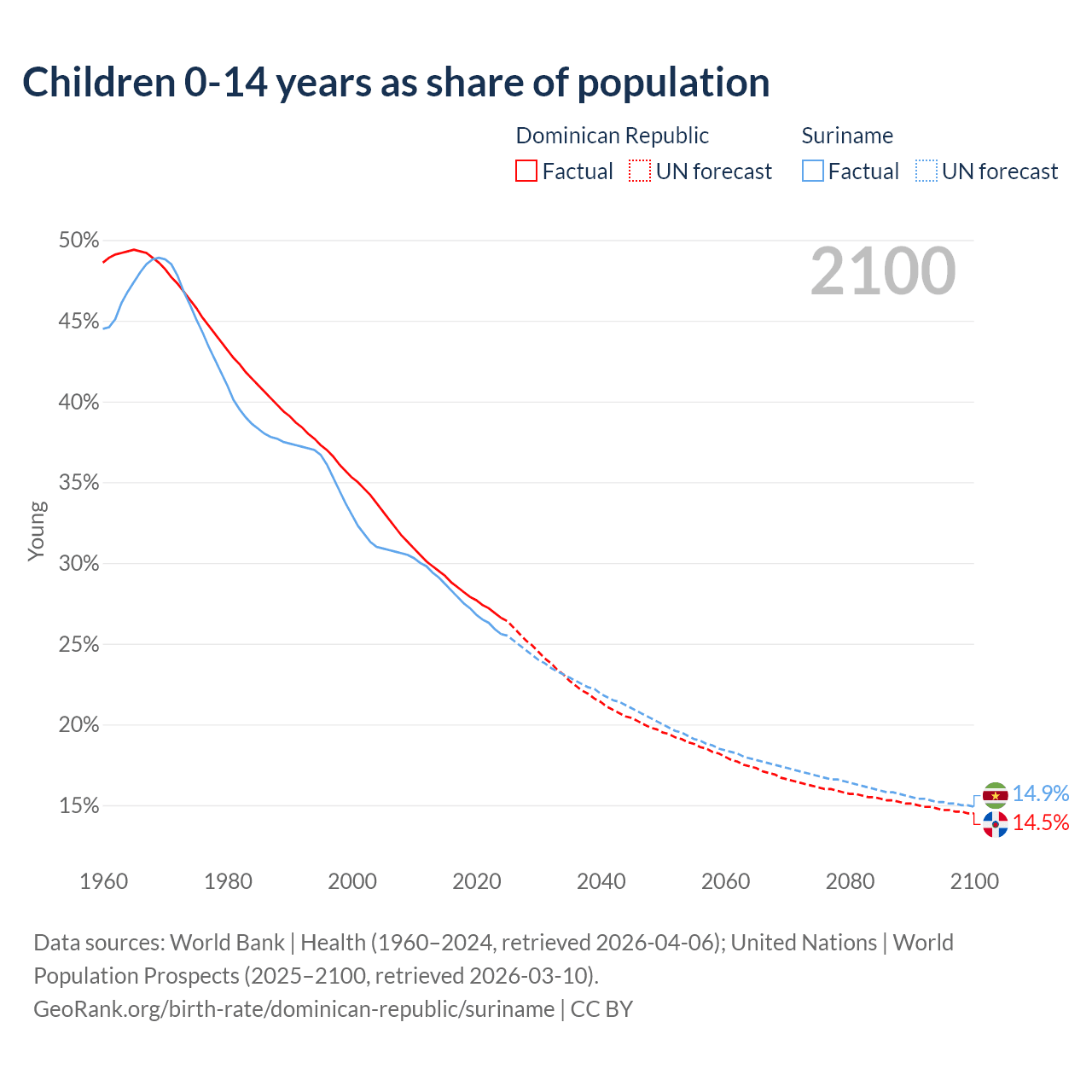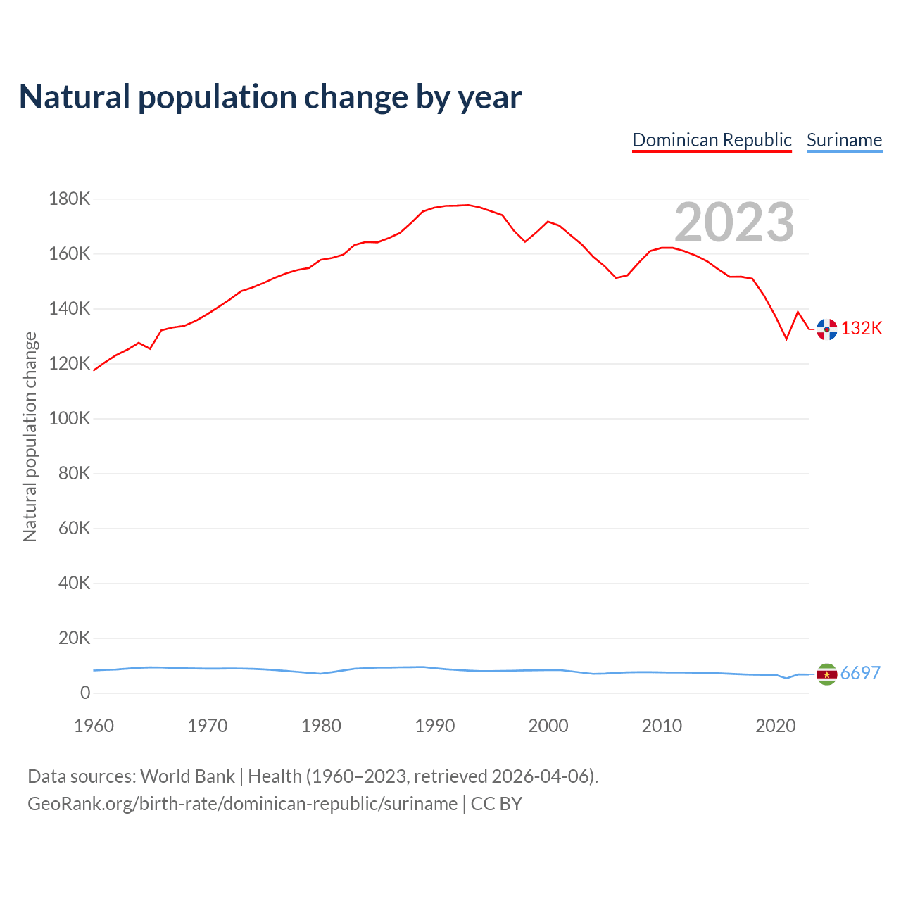 According to the latest available data on birth rates, the fertility rate in the Dominican Republic was 2.24 children per woman in 2023, compared to 2.25 in Suriname in 2023. The replacement level is considered to be 2.1 children per woman.
