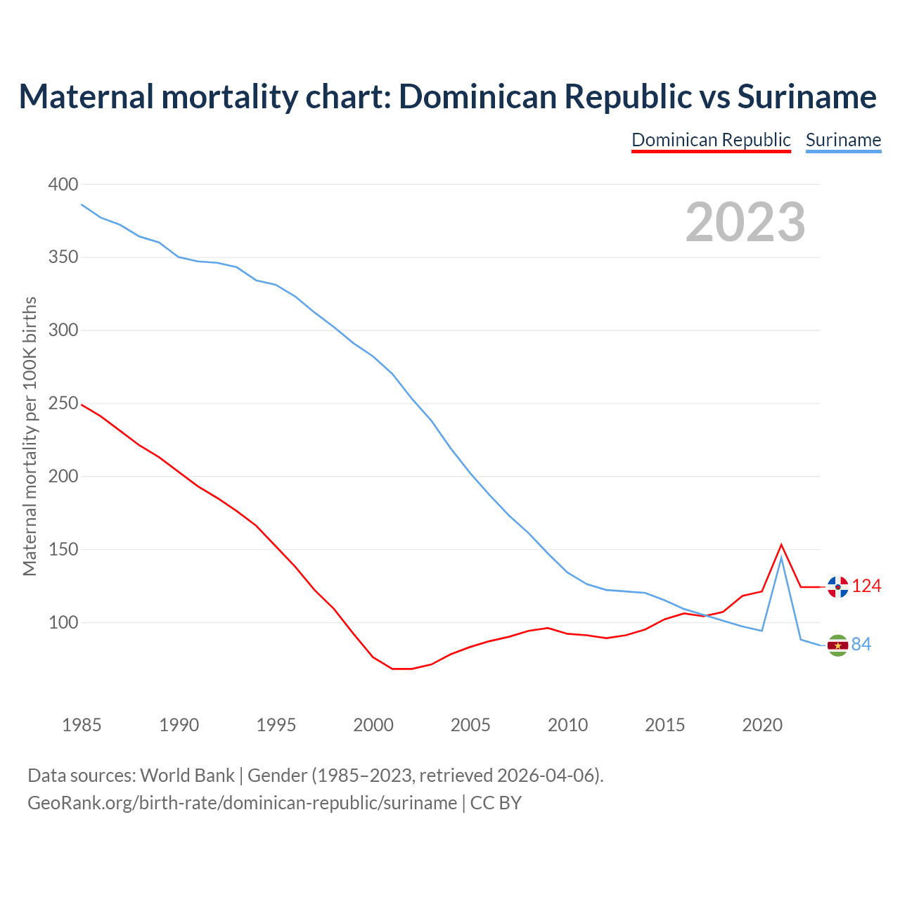 The maternal mortality rate, which is the probability of dying during childbirth or within 42 days of pregnancy termination, is 124 deaths per 100,000 live births in the Dominican Republic, compared to 84 deaths in Suriname.
