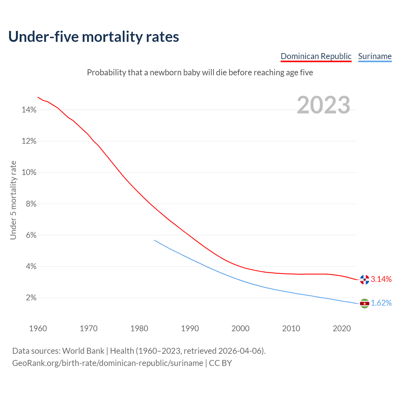 The chance that a newborn baby will die before reaching age five is 3.14% in the Dominican Republic and 1.62% in Suriname. Above is a chart with historical data on under-five mortality rates.