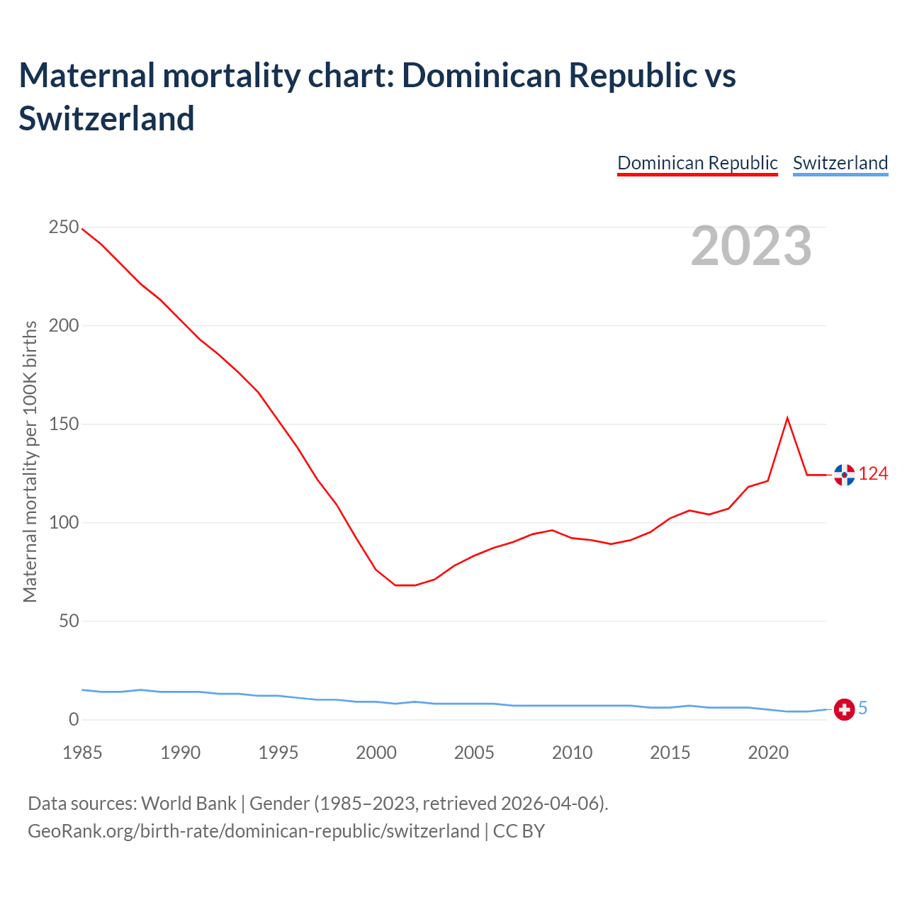 The maternal mortality rate, which is the probability of dying during childbirth or within 42 days of pregnancy termination, is 124 deaths per 100,000 live births in the Dominican Republic, compared to 5 deaths in Switzerland.