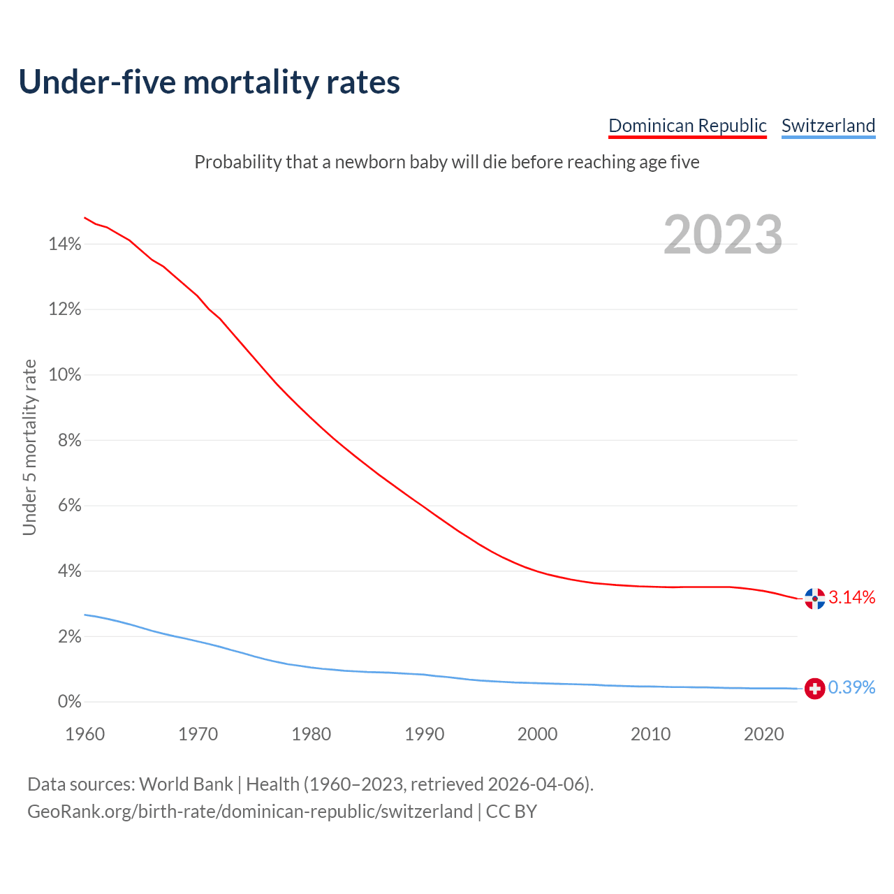 The chance that a newborn baby will die before reaching age five is 3.14% in the Dominican Republic and 0.39% in Switzerland. Above is a chart with historical data on under-five mortality rates.
