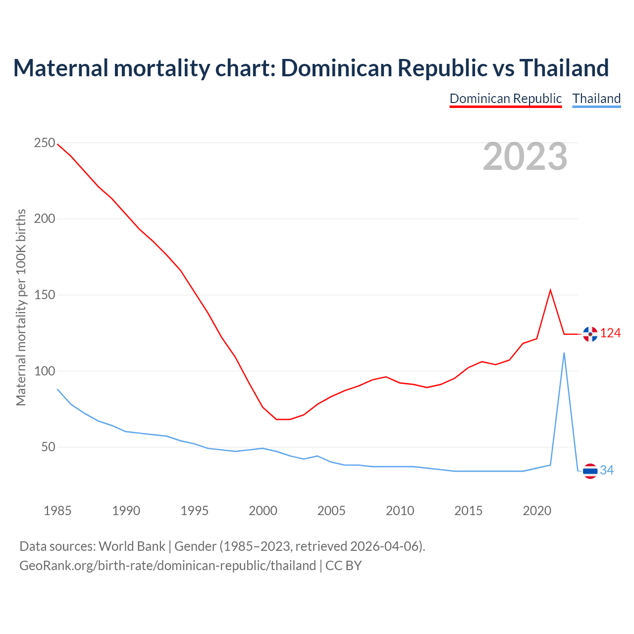 The maternal mortality rate, which is the probability of dying during childbirth or within 42 days of pregnancy termination, is 124 deaths per 100,000 live births in the Dominican Republic, compared to 34 deaths in Thailand.