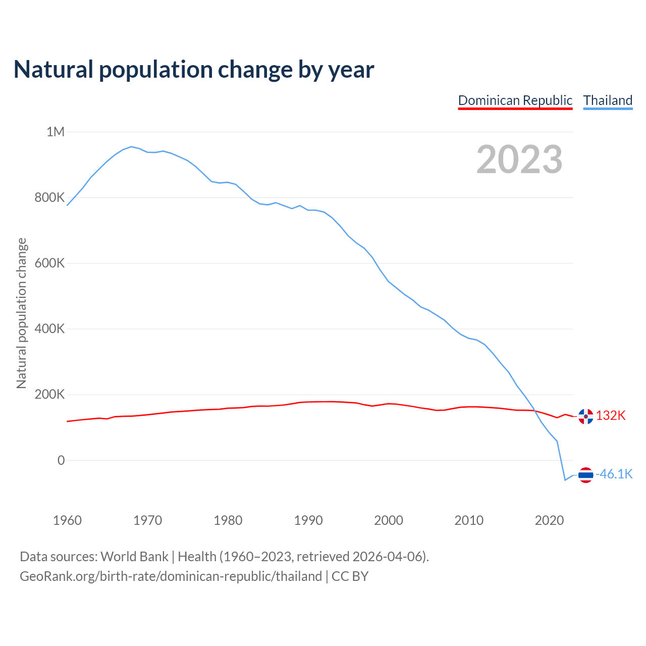 According to the latest available data on birth rates, the fertility rate in the Dominican Republic was 2.24 children per woman in 2023, compared to 1.21 in Thailand in 2023. The replacement level is considered to be 2.1 children per woman.