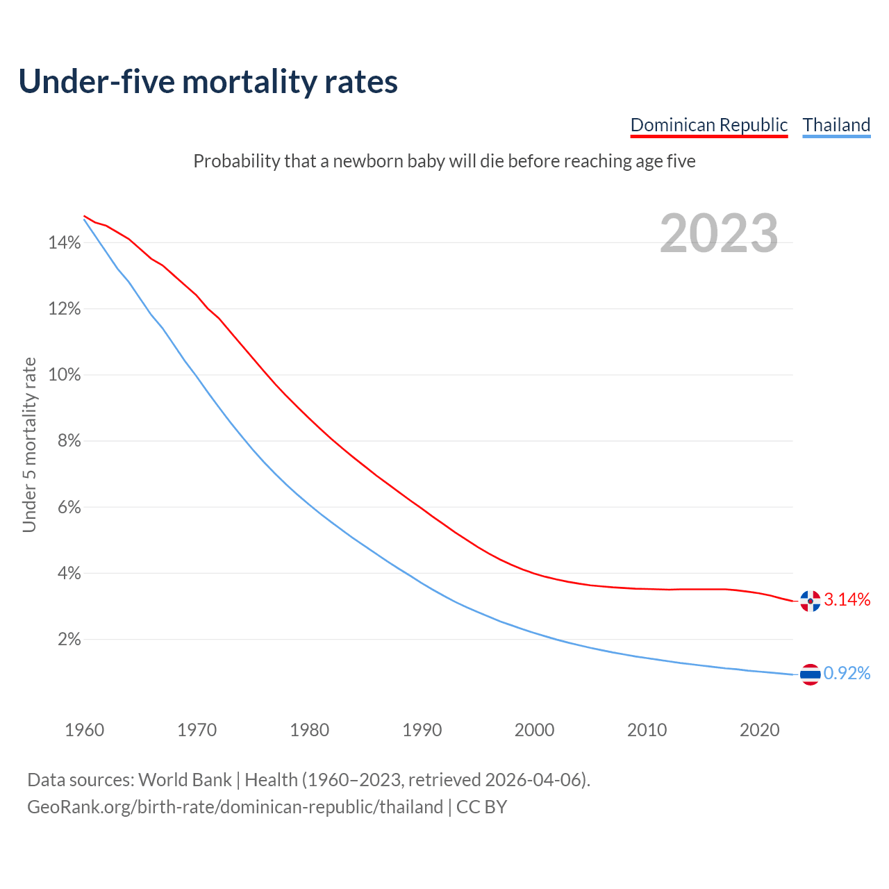 The chance that a newborn baby will die before reaching age five is 3.14% in the Dominican Republic and 0.92% in Thailand. Above is a chart with historical data on under-five mortality rates.