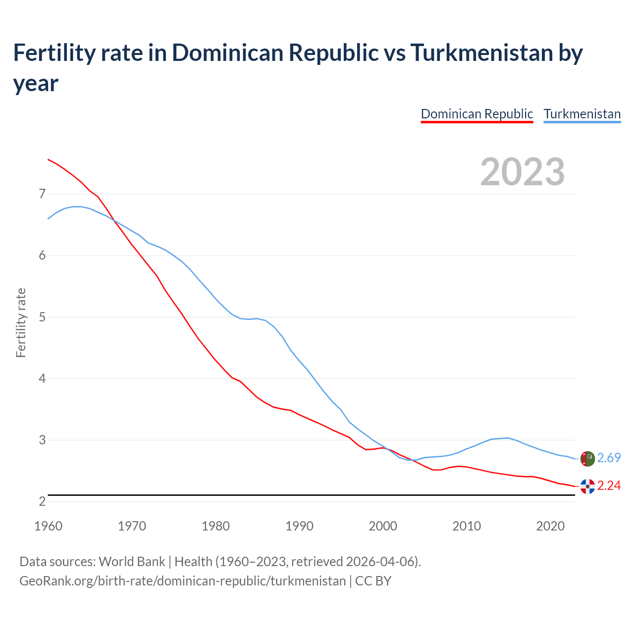 1960 vs 2023, the fertility rate has decreased by 70.3% in the Dominican Republic and by 59.2% in Turkmenistan — in 1960, it was 7.56 and 6.59, respectively.